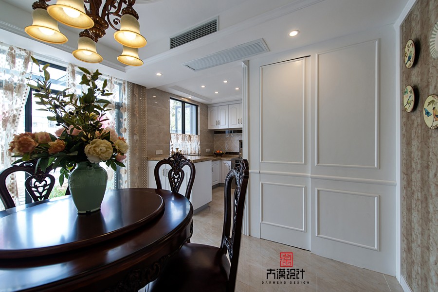 在设计的过程中,对原始户型,我们进行了大刀阔斧的改造,使改后的空间动线变得更加规整,整个空间的美式造型线条也是保持高度统一。在满足业主实际生活所需前提下为设计核心,呈现别具一格的的美式风格的味道。从门板线条造型到护墙板造型保持统一,藻井式吊顶与地面拼花造型协调,匠心独运的隐形门设计既不影响生活所需,也解决了风水问题,软装的搭配也是经过设计师的精心挑选,于是,最终有了《素色浪漫》这套作品的精心呈现 。