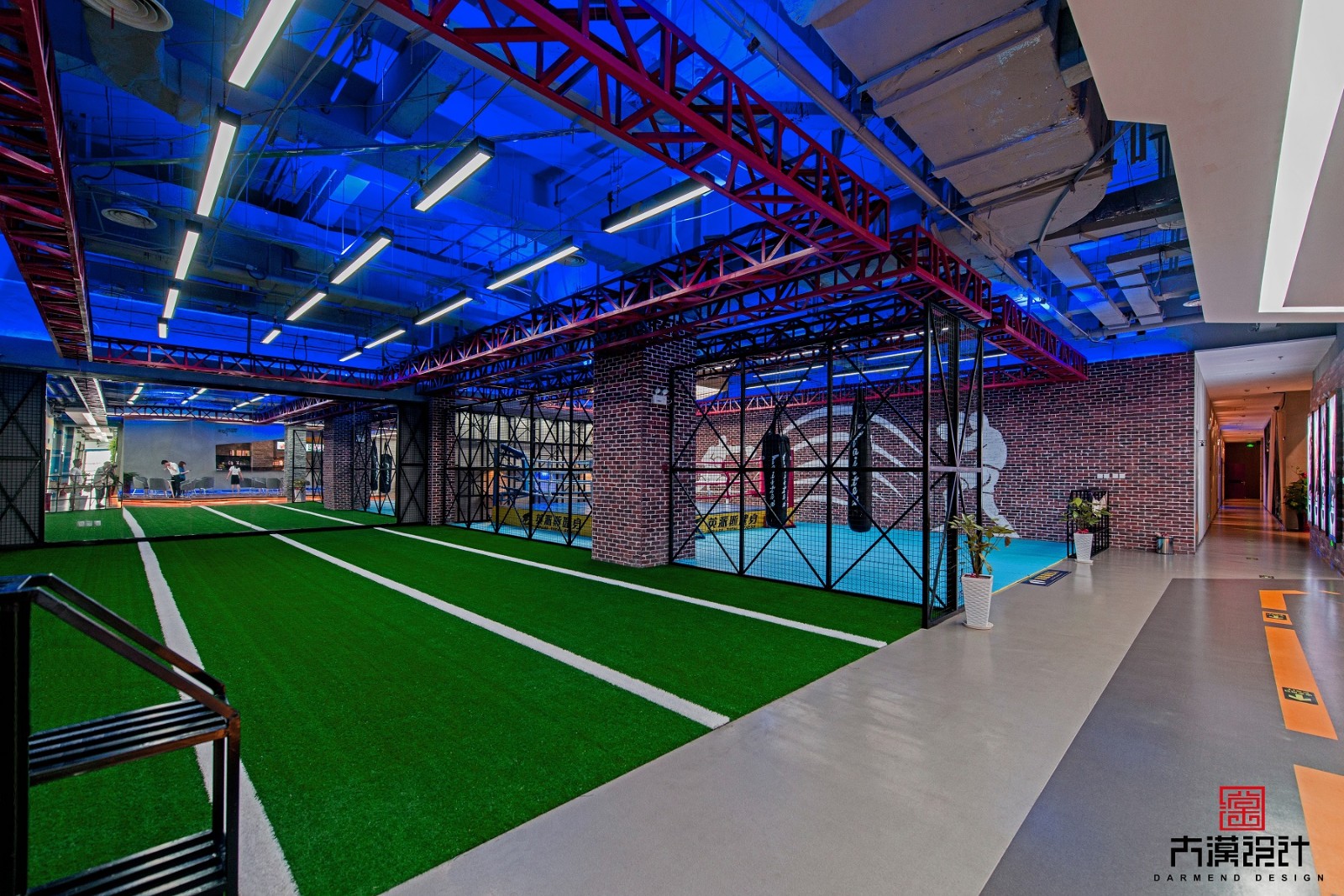 ▲小操房与格斗区,绿色人工草坪代表了舞蹈的柔美,红色的钢架吊顶代表了搏击的力量之美。