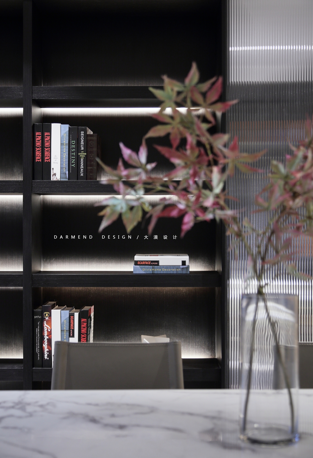 餐厅和门厅的过道的凹凸木饰面背景,自然的形成了空间的律动,给黑白的餐厅空间以变化。衣帽间的门用了长虹玻璃的元素,虚与实,理性与感性