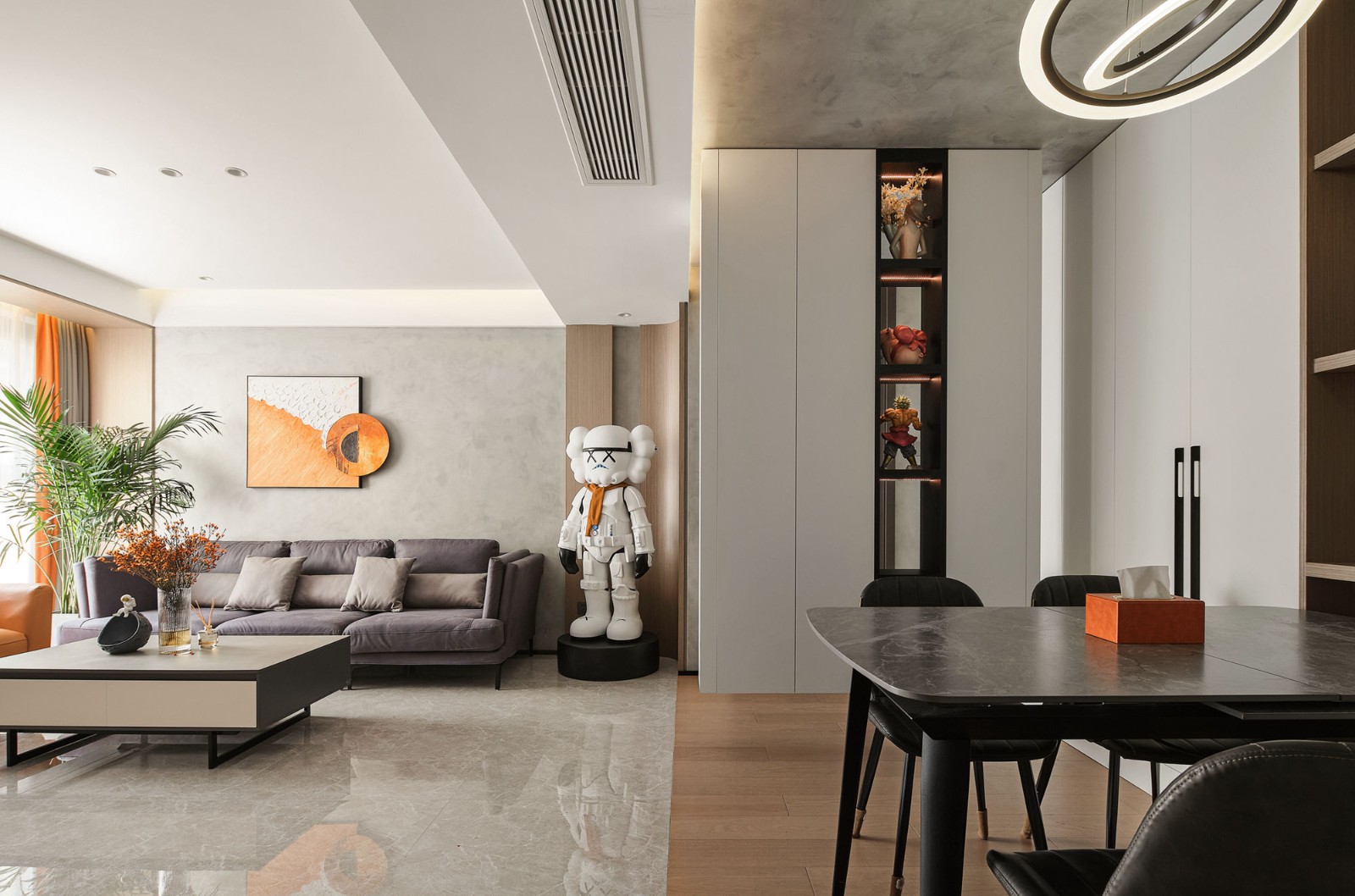 本案业主为一对年轻的新婚夫妇。为了满足基本的空间功能需求,在格局上没有做太大的改动,整体空间以灰白为主,同时增添了一些木色,软装上采用了爱马仕橙点亮了整个空间,纯净又不失温暖……