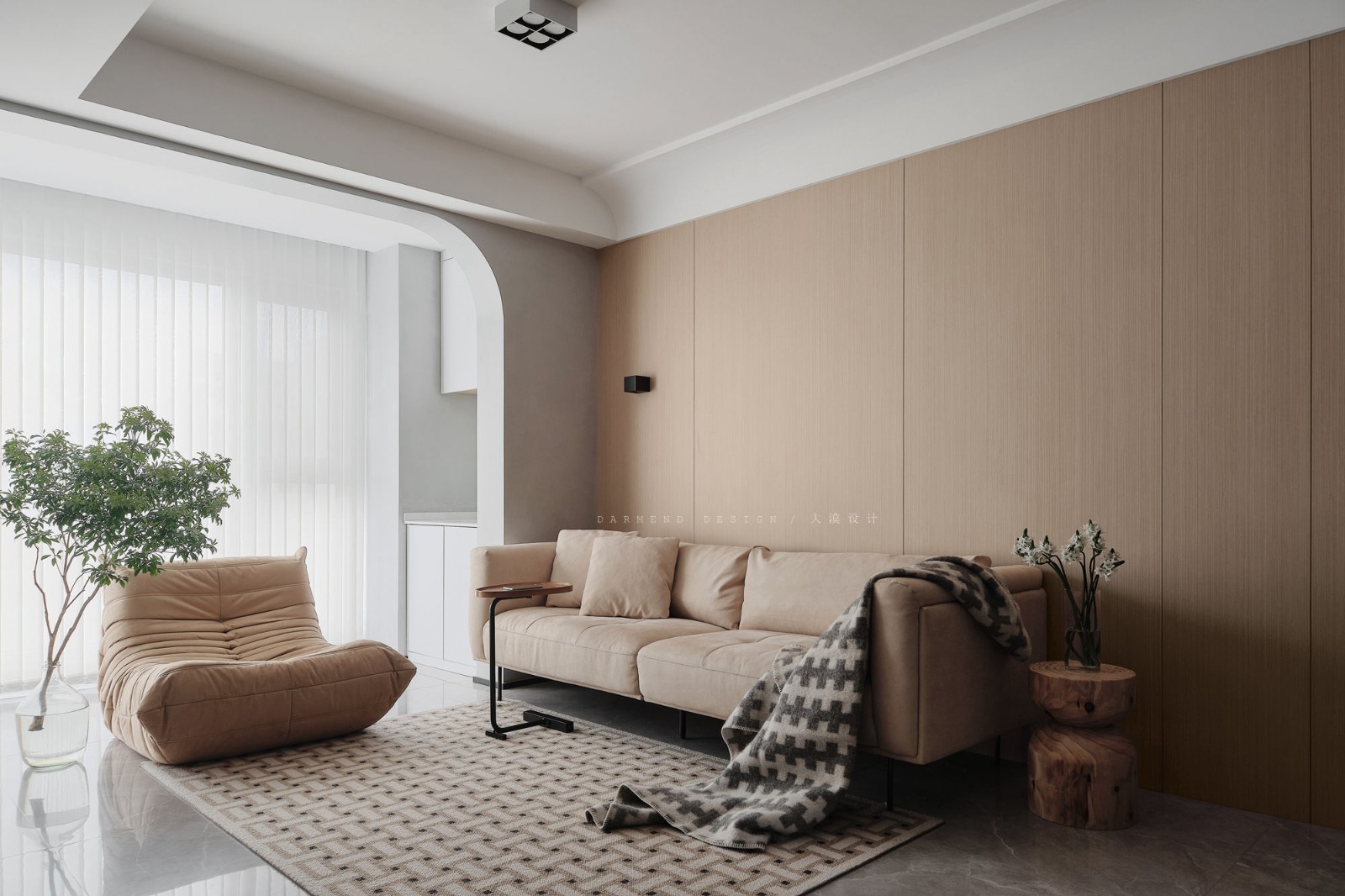 ▲ 沙发来自北欧表情,面料是科技皮革。顶面摈弃了原有传统的回字形吊顶,采用了弧形设计,既拉高了空间,又和阳台弧形门洞相呼应。