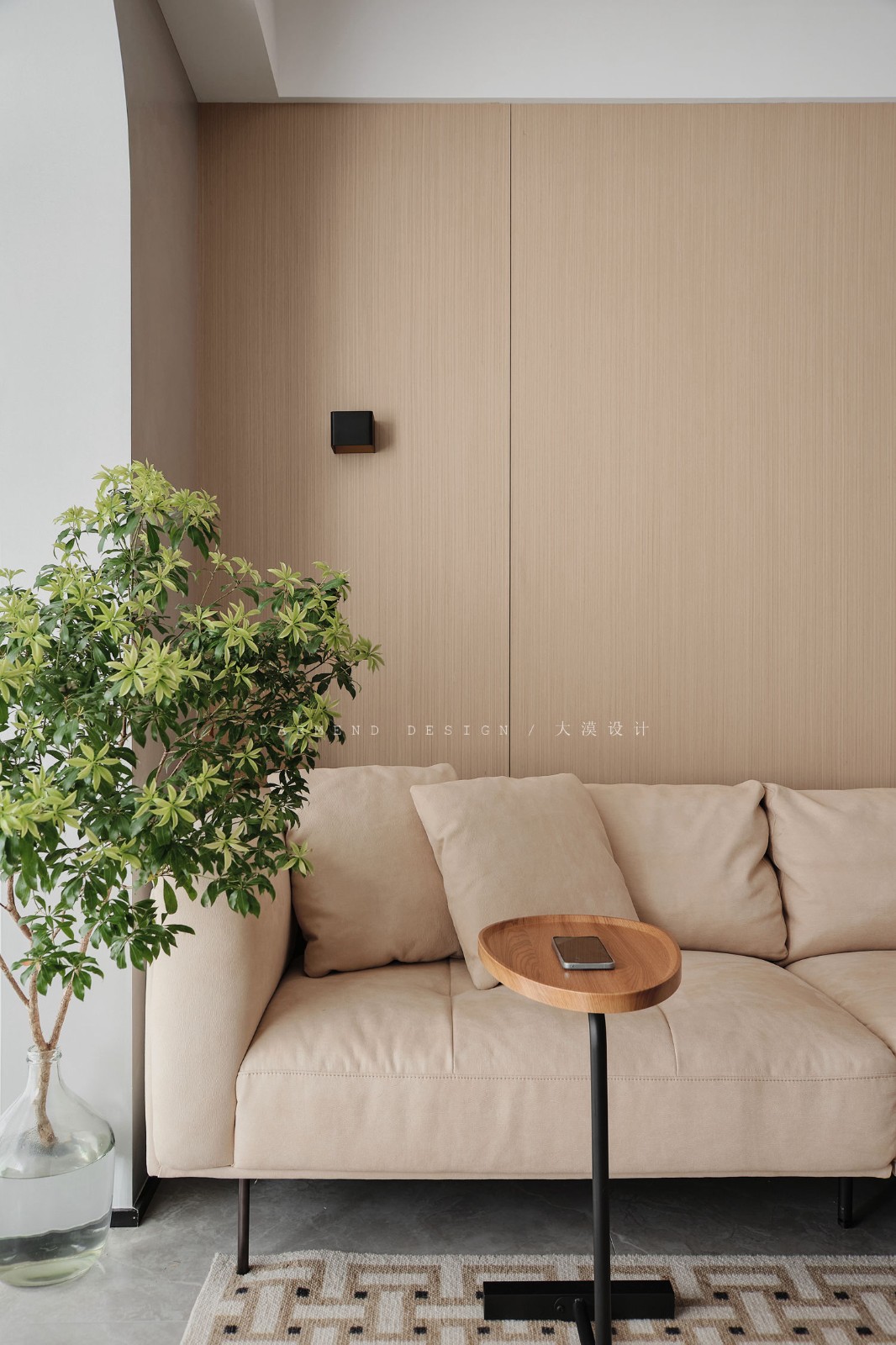▲ 沙发背景采用了大面的木饰面设计。地砖更换了灰色调的7分哑光的砖面,既沉稳了空间,又不失明亮。