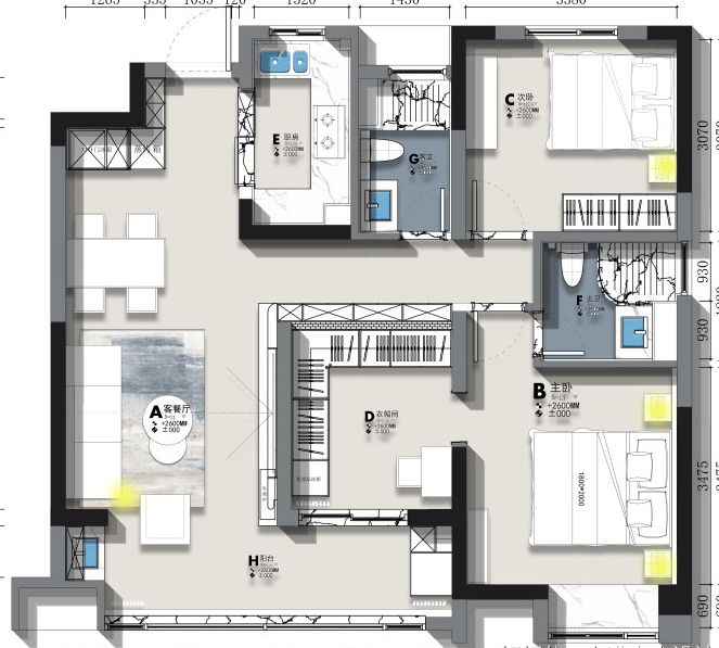 我们首先把厨房里面的冰箱挪到了餐厅位置,又设计出西厨电器柜并加大了冰箱的空间,变成了对开门冰箱。然后拆除了阳台的移门,拓展了客厅的纵深。本案最大的亮点就是把一间次卧改成了主卧的衣帽间,既解决了主卧室衣柜不足的问题,又释放了主卧室的空间,使得主卧室显得不是那么拥挤,然后又利用了过道墙体做了一组展柜用于展示客户的名贵藏酒。之所以这样设计,也是充分了了解客户的需求,这是一对小两口的婚房,深入分析需求之后,发现他们并没有三间卧室的需求,而且几年之后还会换更大的house,才做出了这样的设计改造,所以方案没有好坏之分,只有适不适合。#户型图 #户型改造 #精装房改造#