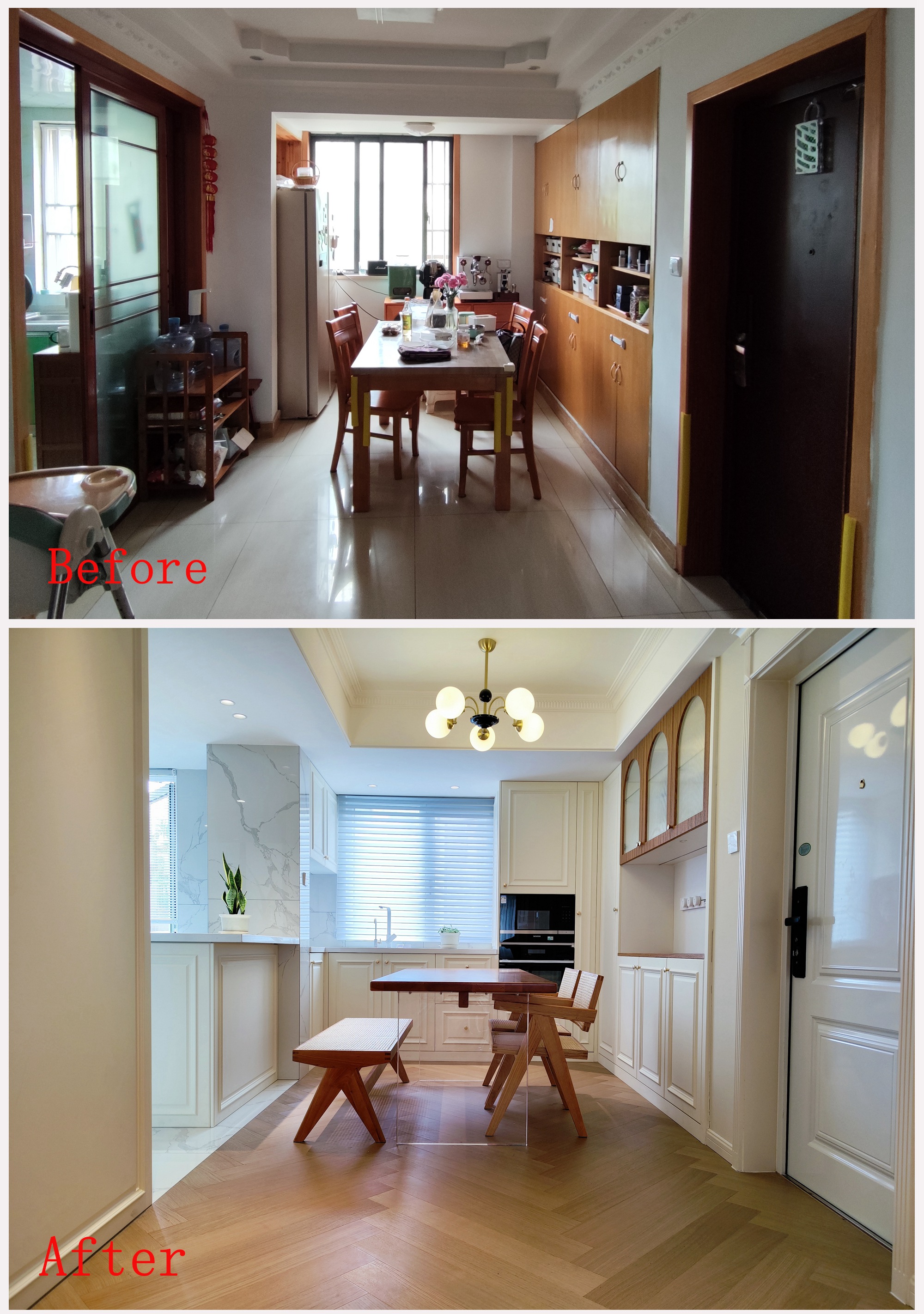 业主是一位长期旅居海外的高知,房子是多年前买的,但装修时间并不长,是由在国内的父母装的,毕竟是隔代人了,审美和年轻人还是有很大不同的。业主回国工作之后,和父母亲都住在这所房子里,就发现了很多的不足,首先是只有一个卫生间,三代人居住,就会有诸多的不便,还有收纳空间严重不足,规划的也不甚合理,加上审美也不在线,让业主一度想再买一套大房子,但是这所房子有一个不可多得的加分项,开发商附赠了一个300多平的大露台,实在是太舒服了,考虑再三业主决定重新装修这所房子。 首先解决的就是增加一个卫生间,还必须要保证三房。我们借用了北卧室的空间和原卫生间的一部分,还要结合原有的下水去解决了这个问题。然后就是重新规划了厨房餐厅的布局,根据业主的海外生活习惯设计了开放式厨房、岛台、西厨空间,嵌入式冰箱、和很多的柜体。再就是阳光房&洗衣房的设计,也极大了方便了生活。 风格上面,业主有一些刚买不久的家具,电视柜、沙发、餐厅柜等等需要保留,我们就结合原有家具和客户的喜好混搭了风格,有点法式、有点美式、还有点中古...总之业主喜欢、好看就行。