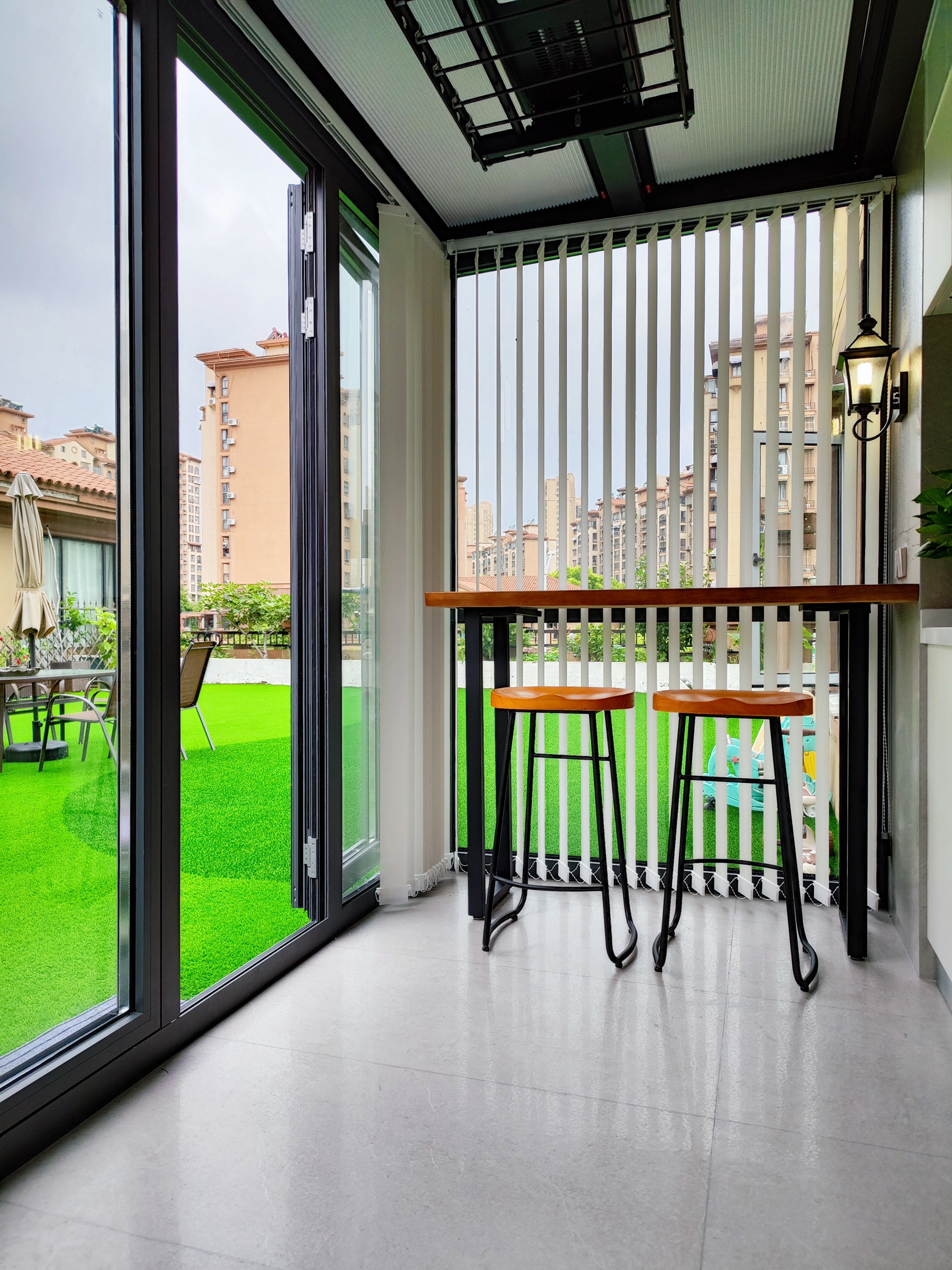 ▲重点介绍,这款电动阳光房顶帘,来自杜亚品牌。这样夏天就晒不黑了,冬天也可以坐在吧台上享受温暖的午后咖啡。