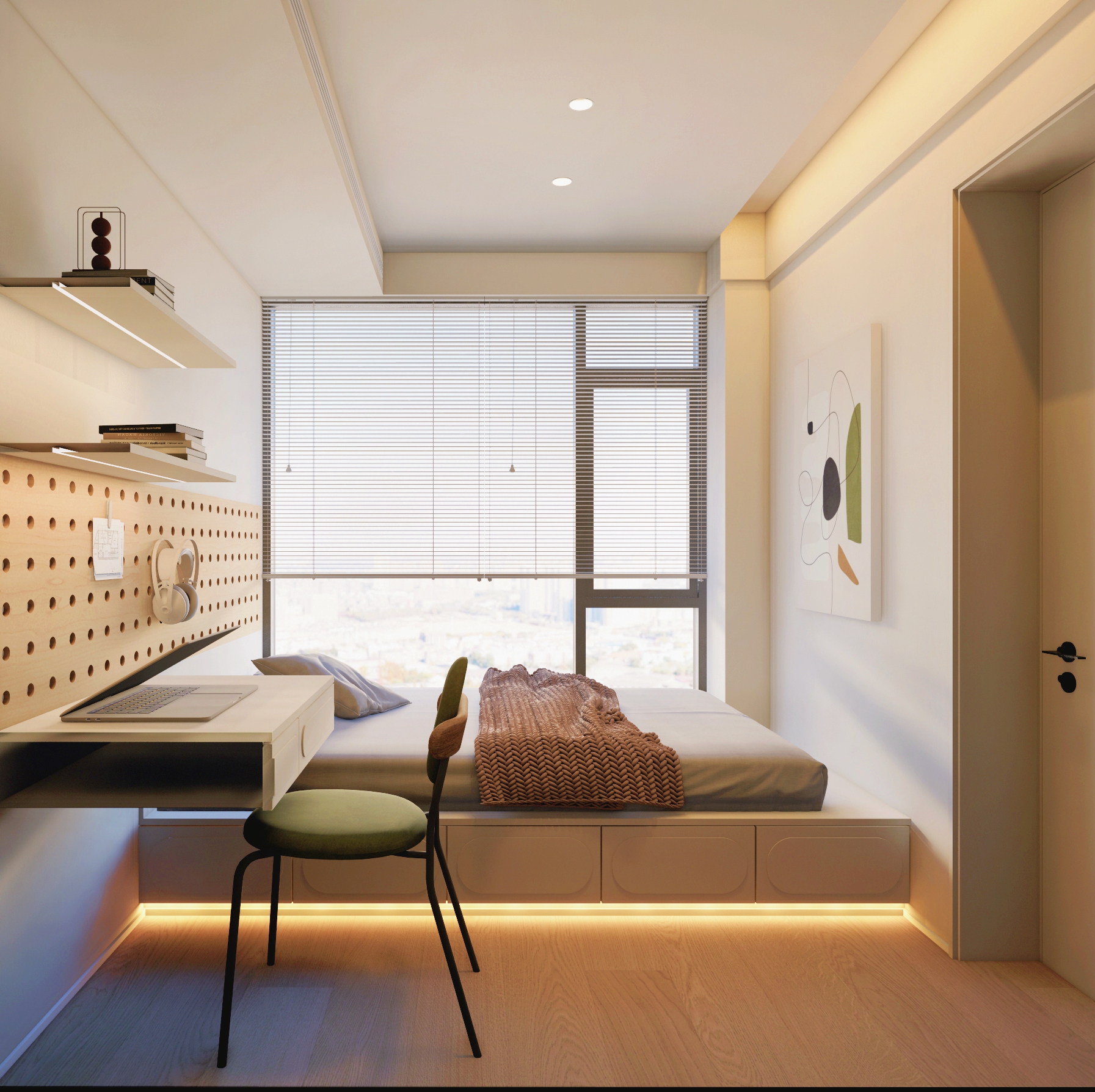 ▲这是一间榻榻米加书桌的多功能房设计,洞洞板的作用除了装饰效果外,实用性也不错。