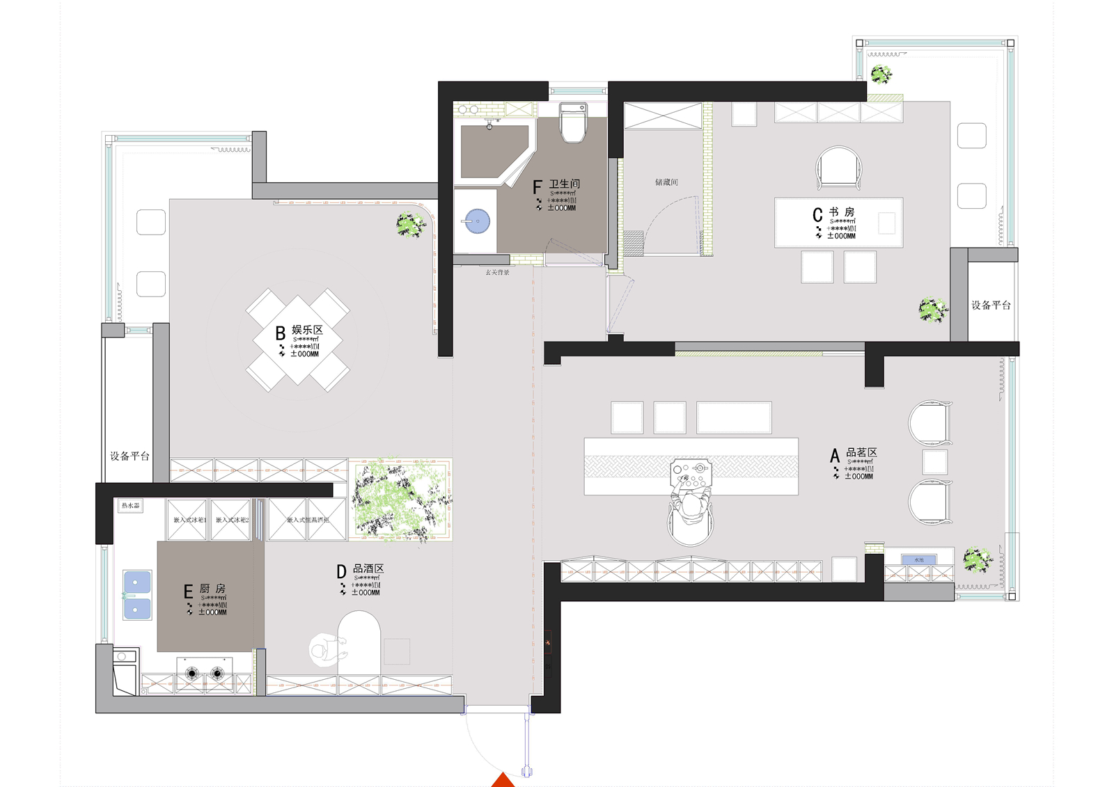 本案屋主是一位成功的商业人士,置办这一处房产是为了和朋友小聚,喝茶、品酒、棋牌。所以在功能上,我们首先考虑的是一间小型会所的功能,但本身这是一处住宅,所以也要考虑其后期的居住属性,在设计上我们预留一些可塑性,在以后可以很方便简单的改造成一处同样有品质的居所。