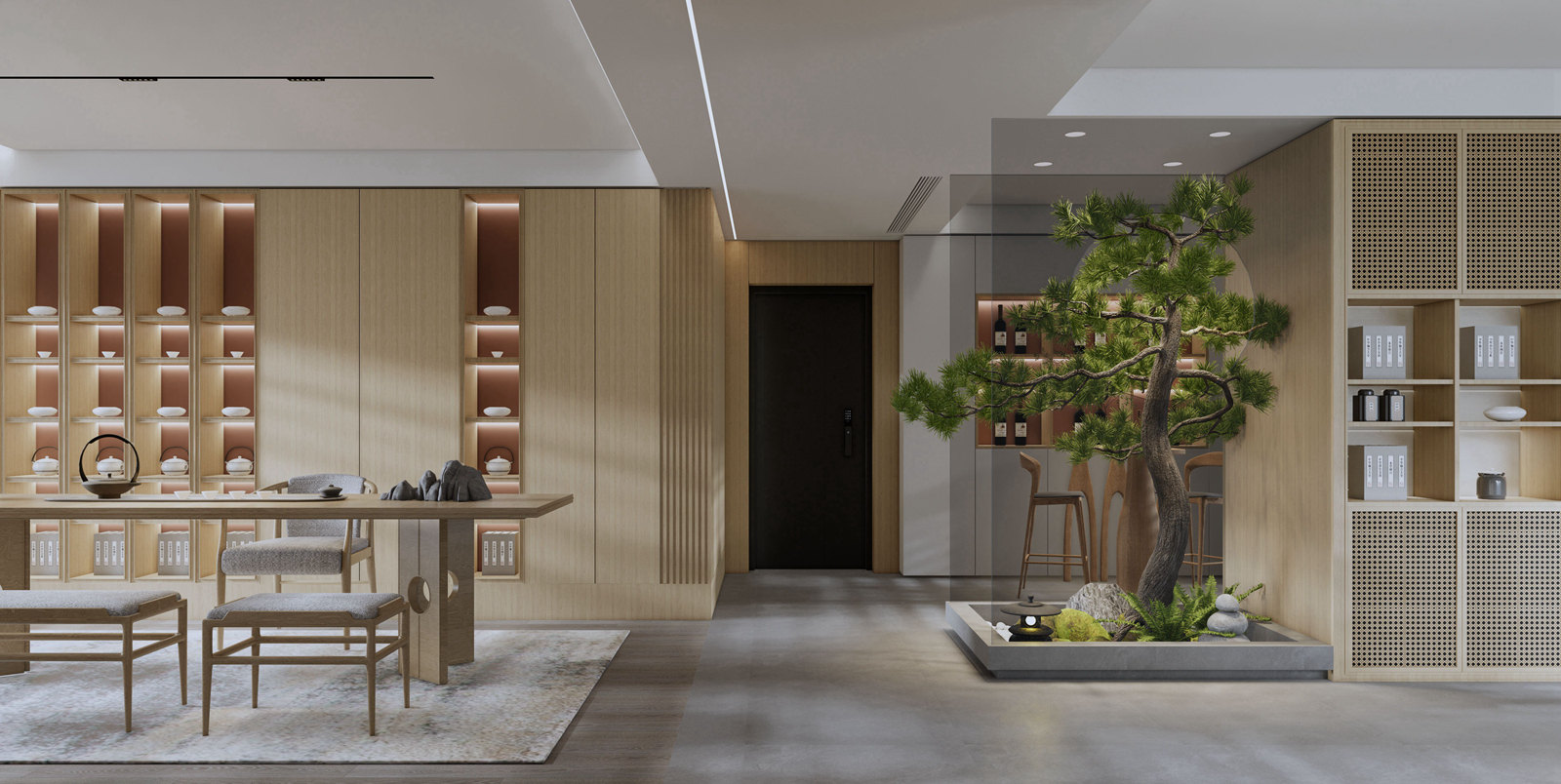 ▲入户的景观松树小品是本案的亮点,茶室背景为定制的涟漪水波纹JOG构件,可以直接在上面做乳胶漆等涂料。