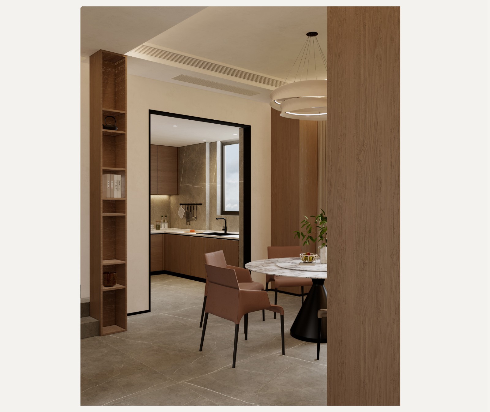 这是品茶区,业主平时有品茶的习惯,茶桌背后做了些格子,用来放一些茶具和书。