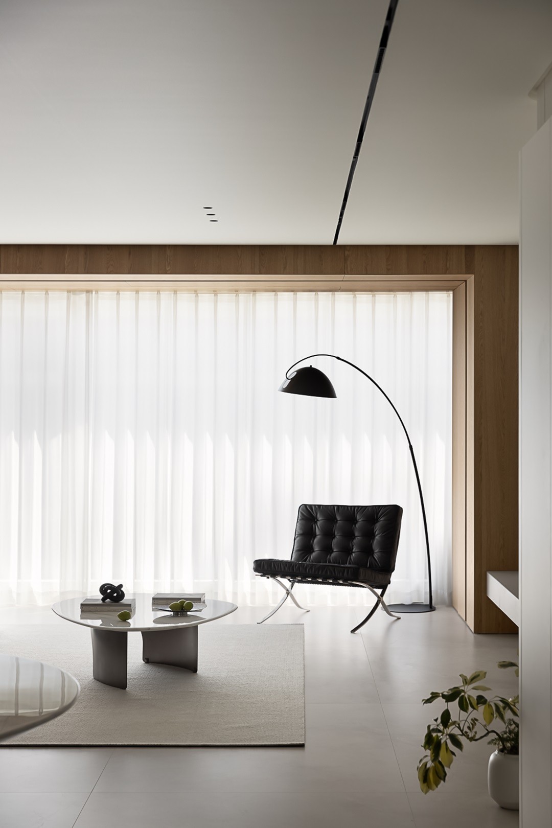 ▲大量地采用了木头这种温柔的材质,带点灰咖调的木饰面从吊顶延伸至地,像一只手将窗边的空间包裹起来,给人以温暖、松弛的感受。