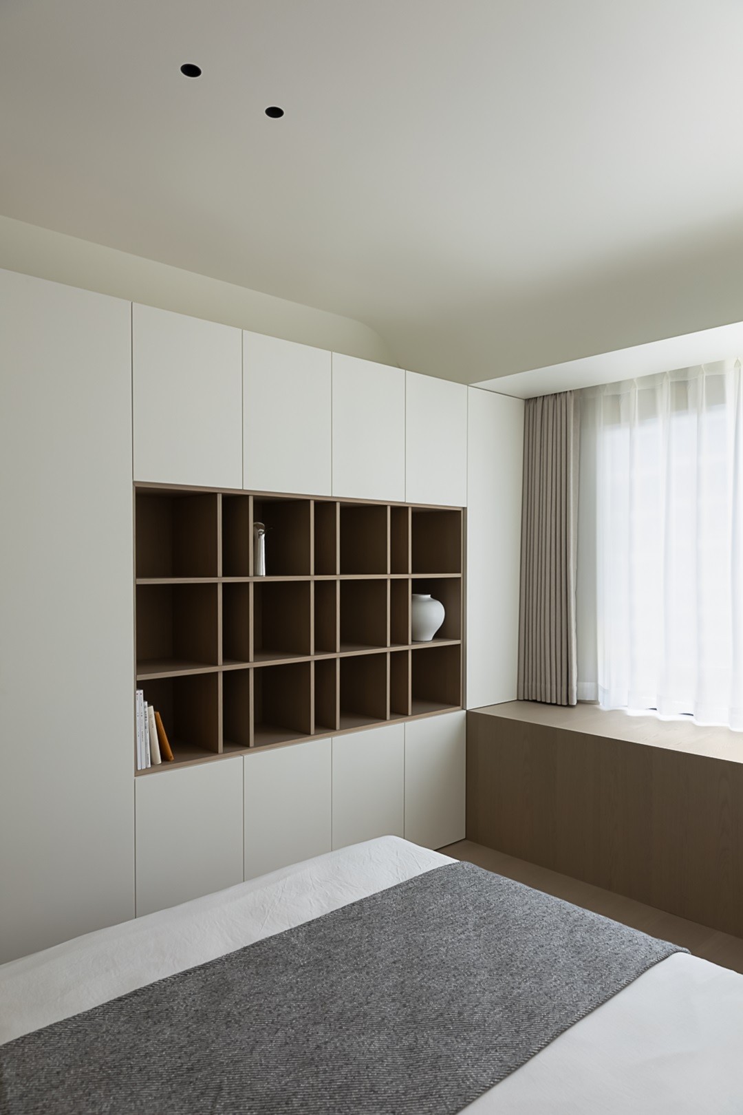 ▲主卧原本的格局中主卫的门对着床头并不理想,悬空柜在床和卫生间中间形成一道“影壁”,即隔开了卫生间,又让空间丰富而有趣。