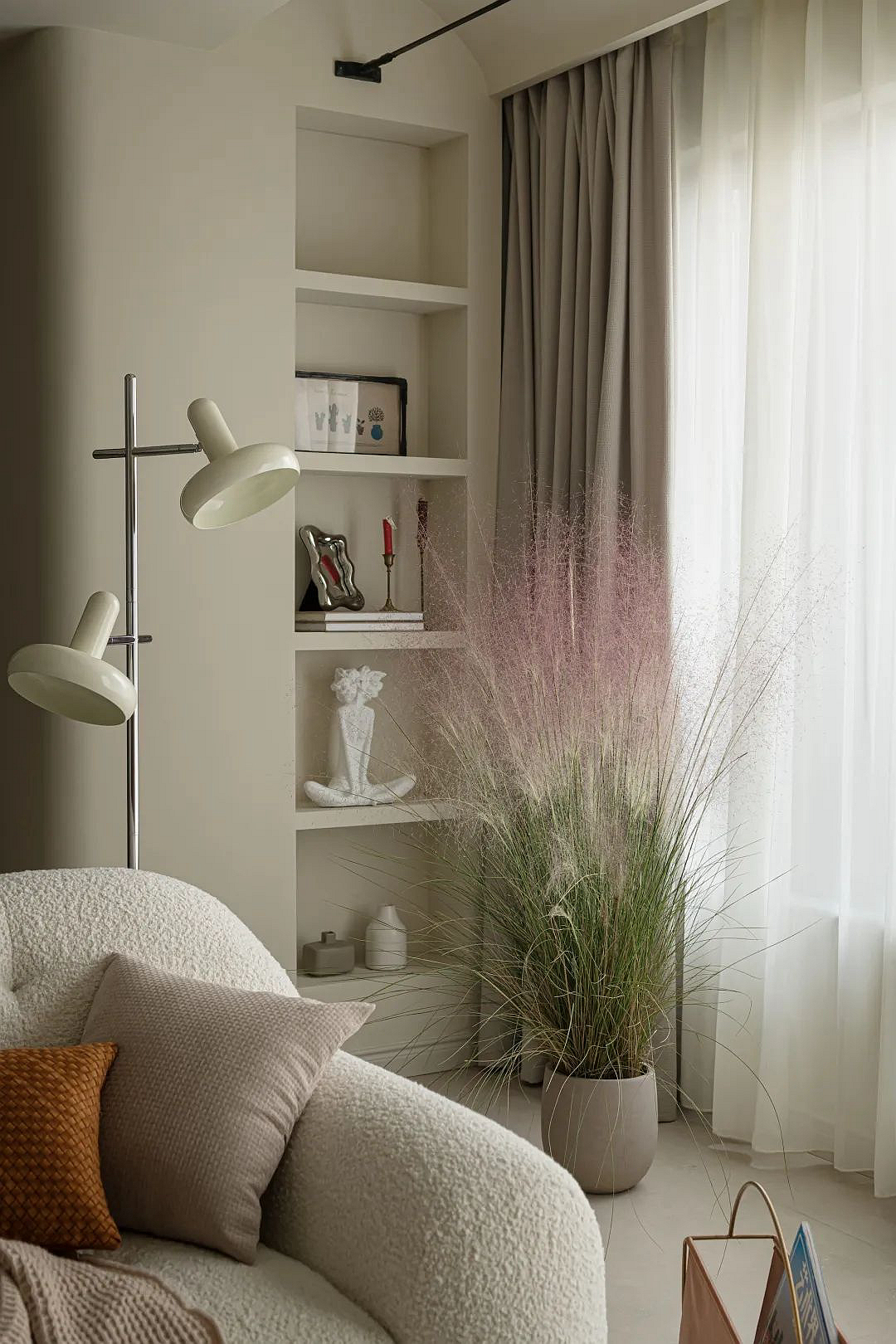 舒适乖巧的家具为空间增添了温馨与稳重。整屋大面积的奶油色系自带温柔治愈的气息,柔和流动的线条体现了空间的慵懒舒适。