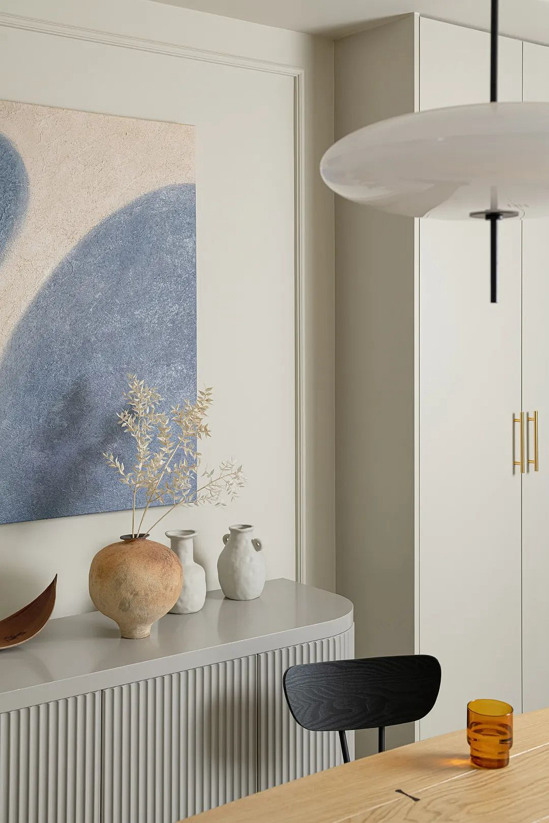 吊顶圆润的弧形与统一的奶油色调奠定客餐厅基调,靠近厨房的餐厅背景墙设计成圆弧造型,与盥洗间,玄关处的圆弧门洞相呼应,丰富空间层次。