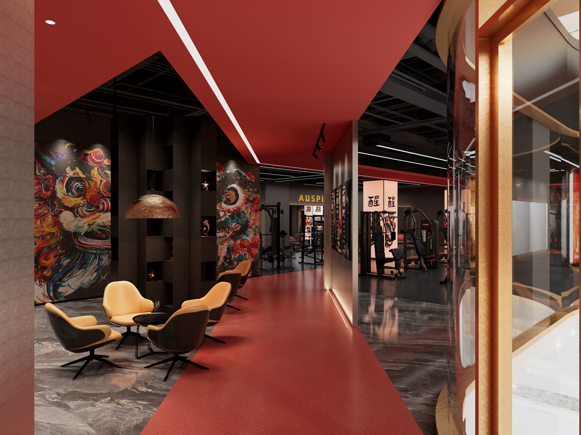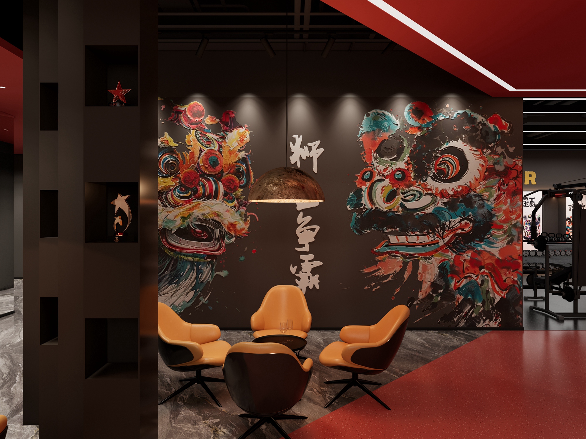 本案为健身房改造项目,以"狮王争霸"为主题,打造极具视觉冲击力的国潮风健身空间。设计团队突破传统,大胆采用"天地同辉"的创意手法——顶部悬浮式红色吊顶与地面定制红色地胶形成上下呼应,犹如雄狮腾跃的轨迹贯穿全场。墙面运用3D立体彩绘工艺,将醒狮图腾与现代健身场景完美融合,配以动态光影效果的LED灯箱,生动再现狮王争霸的震撼场面。整体空间通过解构传统醒狮元素,结合工业风材质与赛博朋克灯光技术,创造出既传承岭南文化精髓,又充满未来科技感的硬派健身空间,重新定义国潮运动美学。