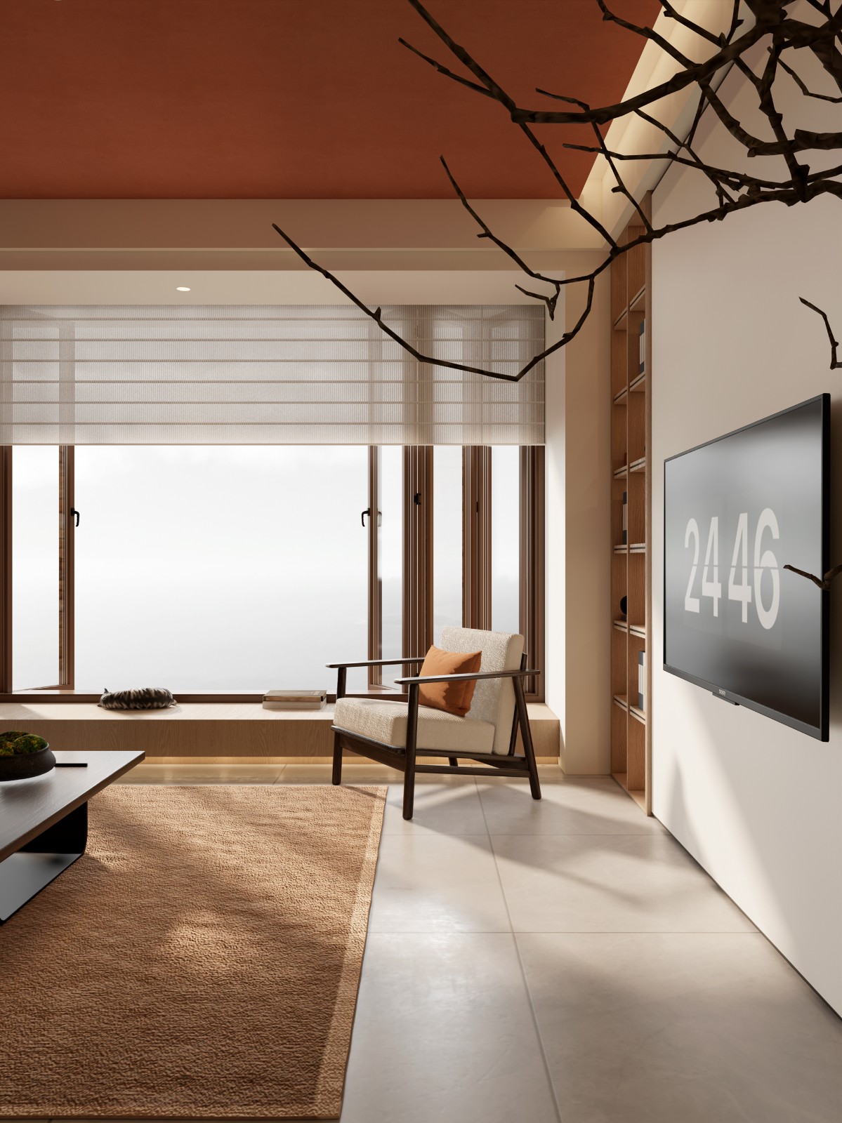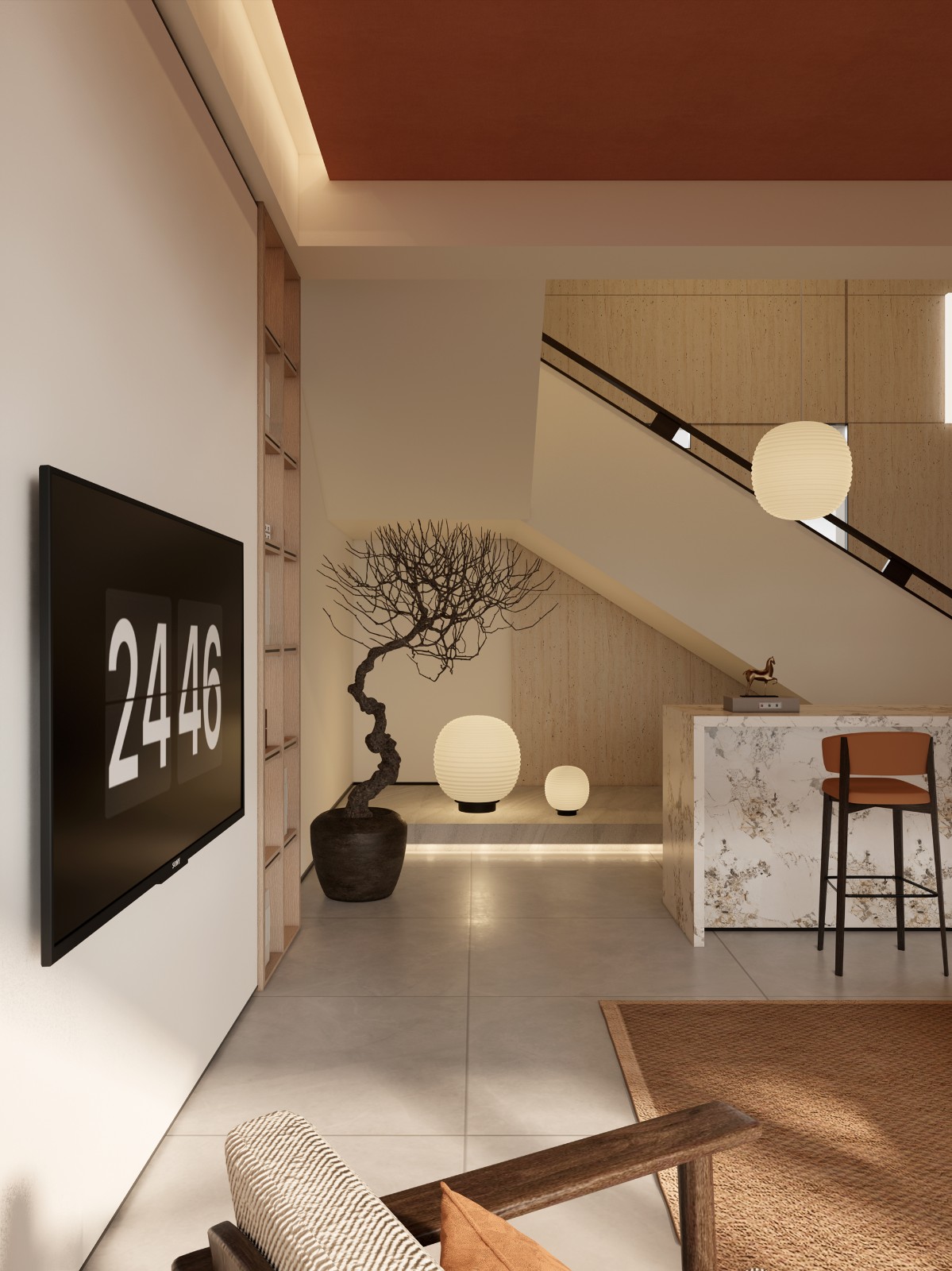 智能隐逸:全屋智能系统,地暖温度通过手机预设,冬日赤足行走于大地色瓷砖的地面,暖意自下而生。