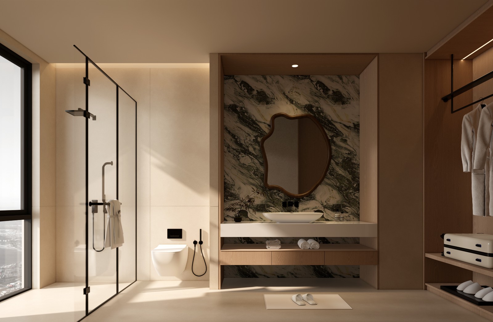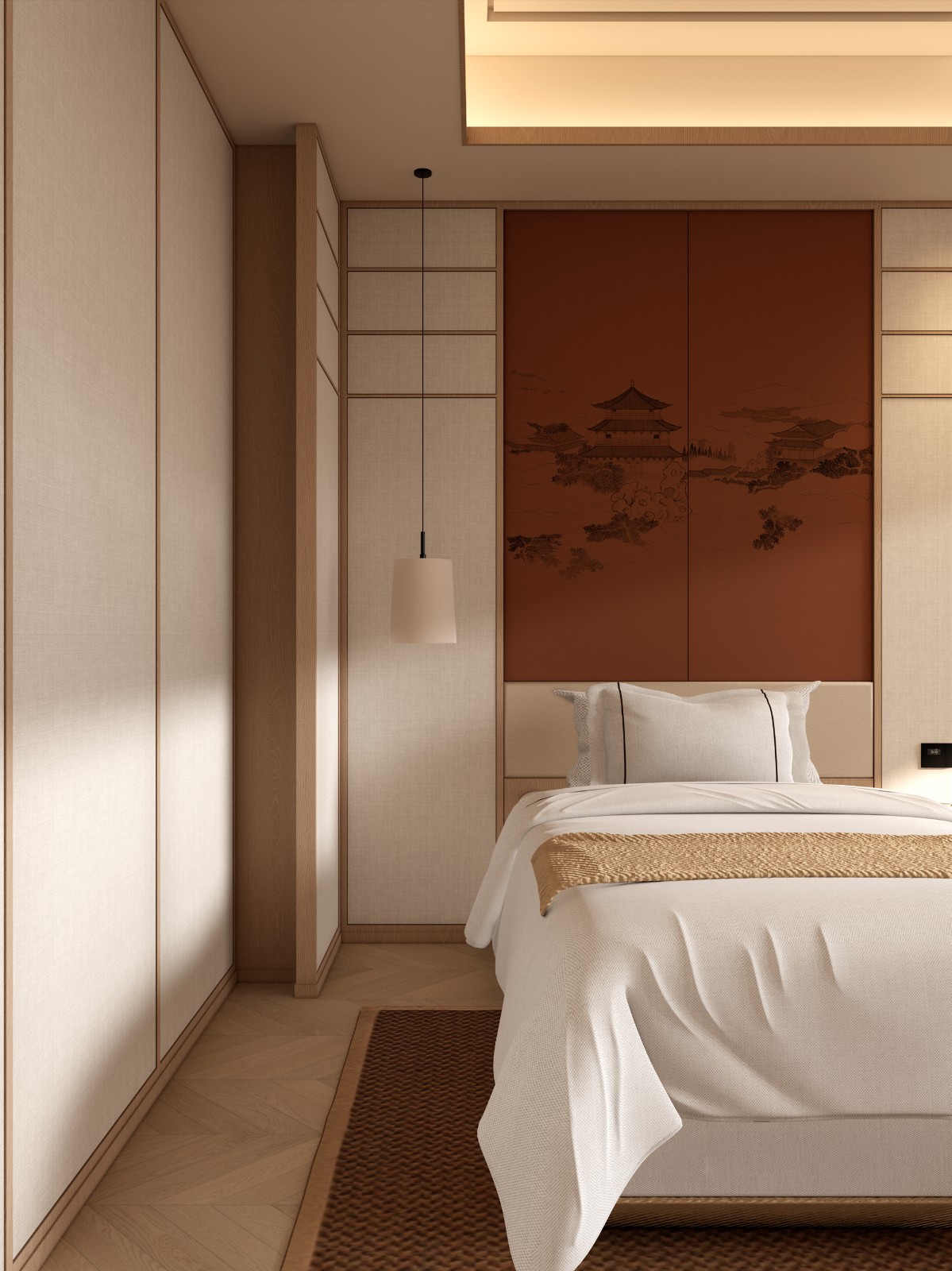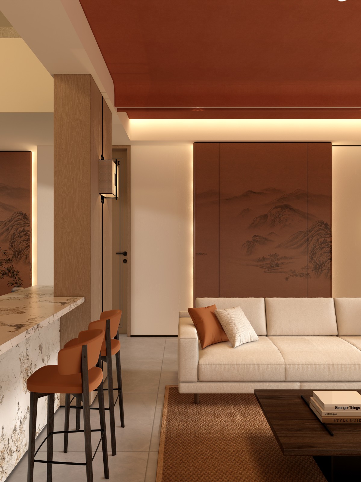光影序列:全线采用2700K低色温照明,重点区域以磁吸轨道射灯营造山水画“留白”意境。