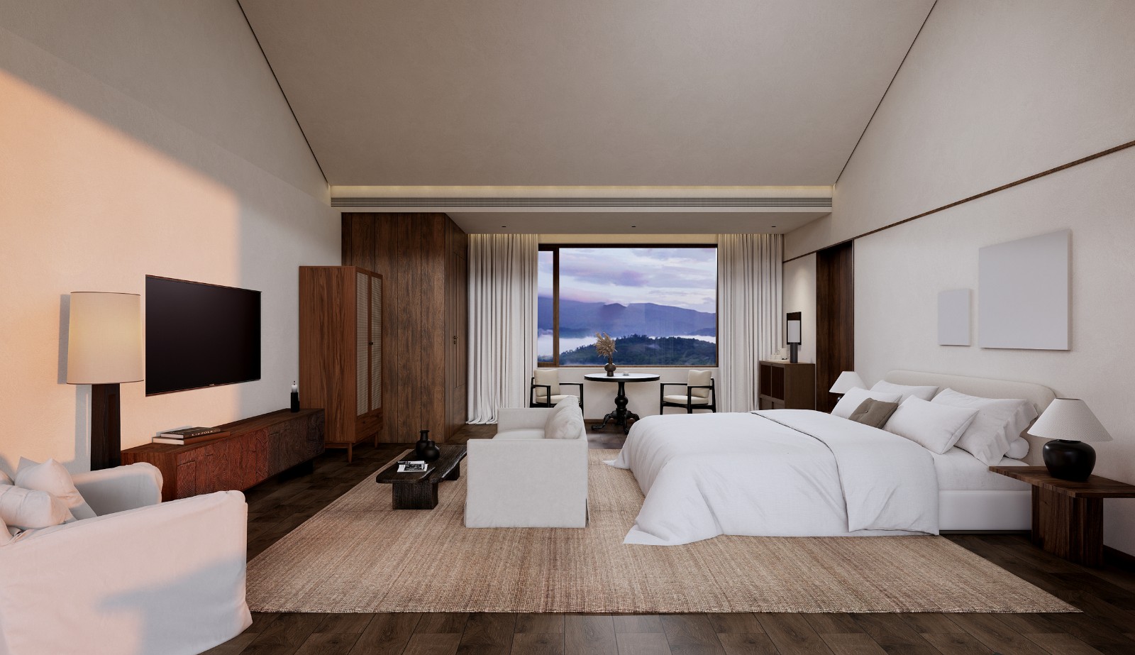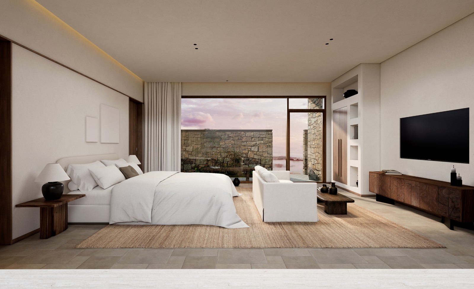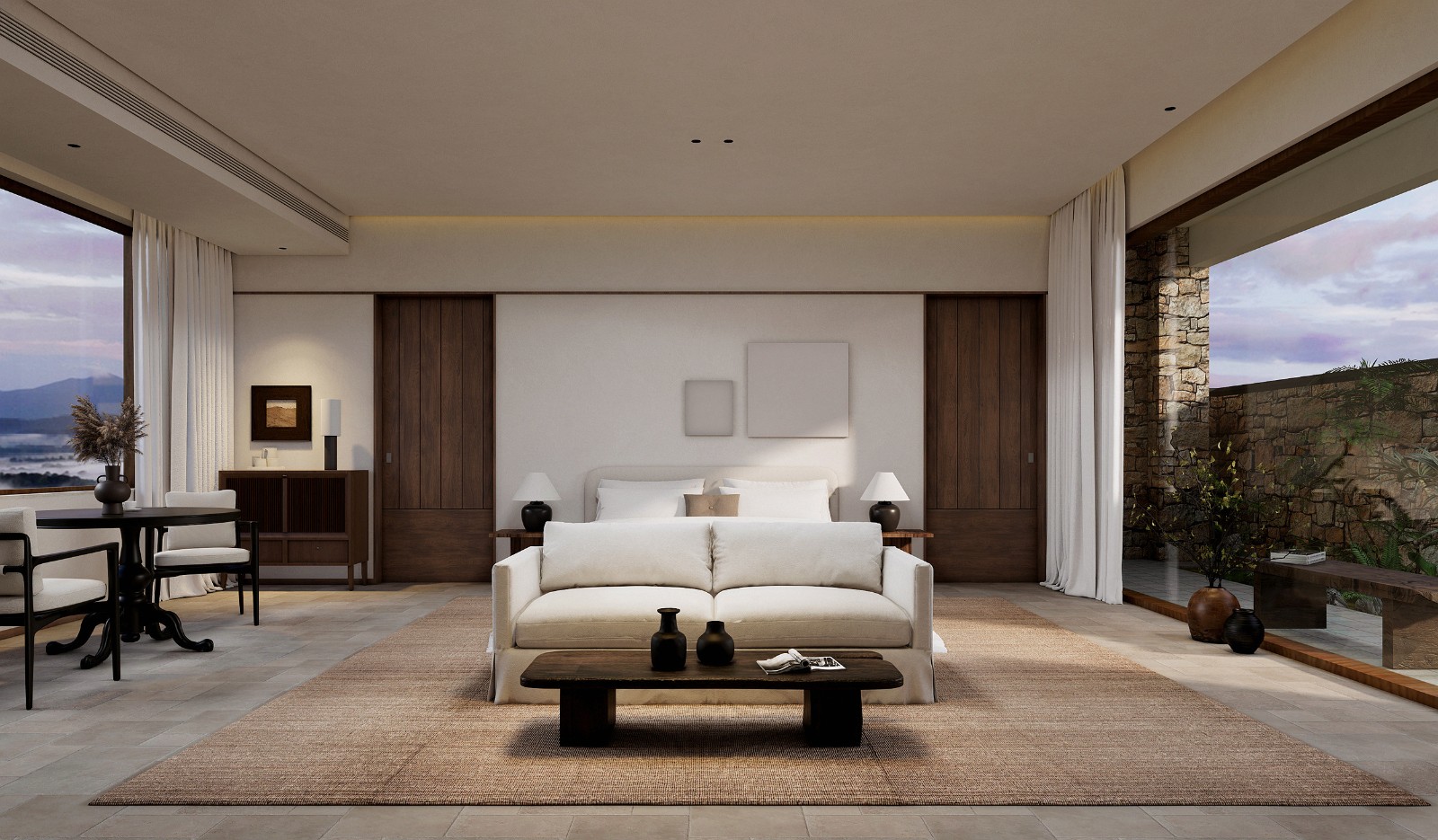 空间被拆解、重组。穹顶之下,睡眠区沉入半围合的“茧”中,粗麻帷幔垂落如息。榻上铺着未染色的苎麻床品,每一条褶皱都盛着阳光晒过的蓬松。浴区石块垒出天然泉池的模样,水流声成为唯一的白噪音。