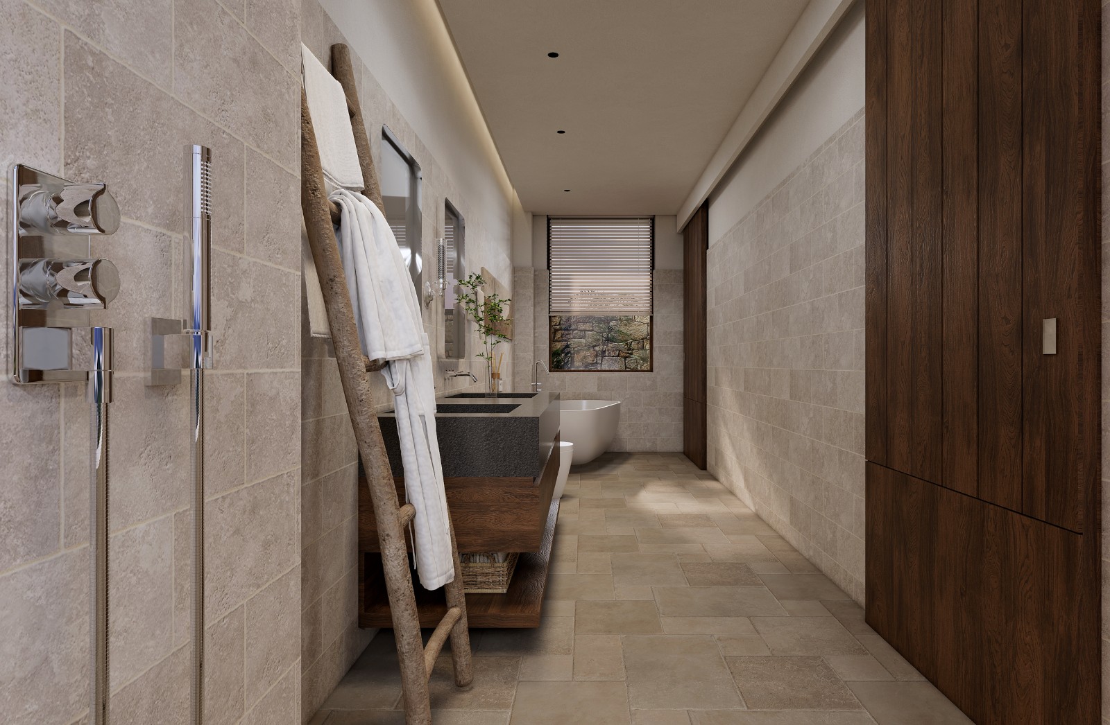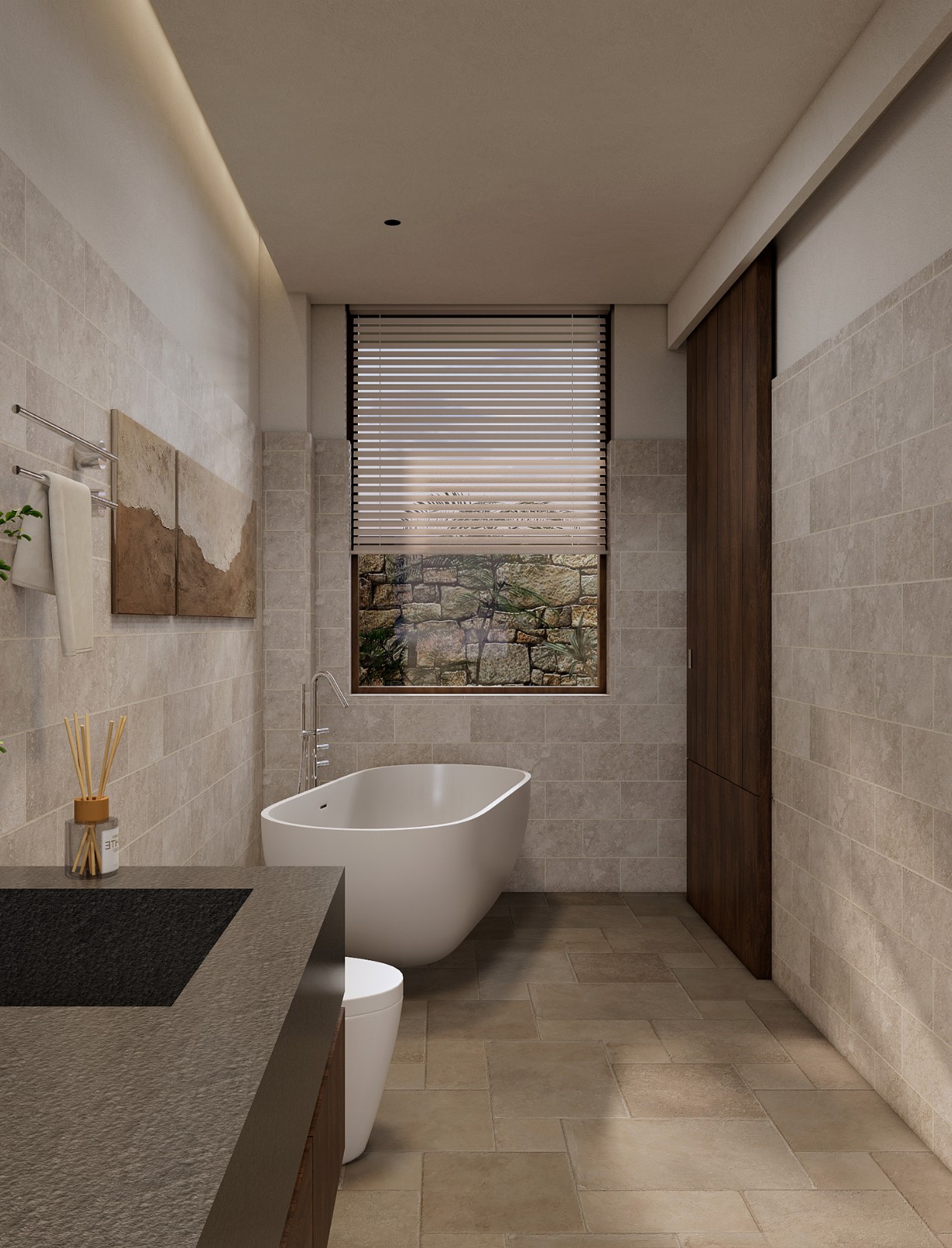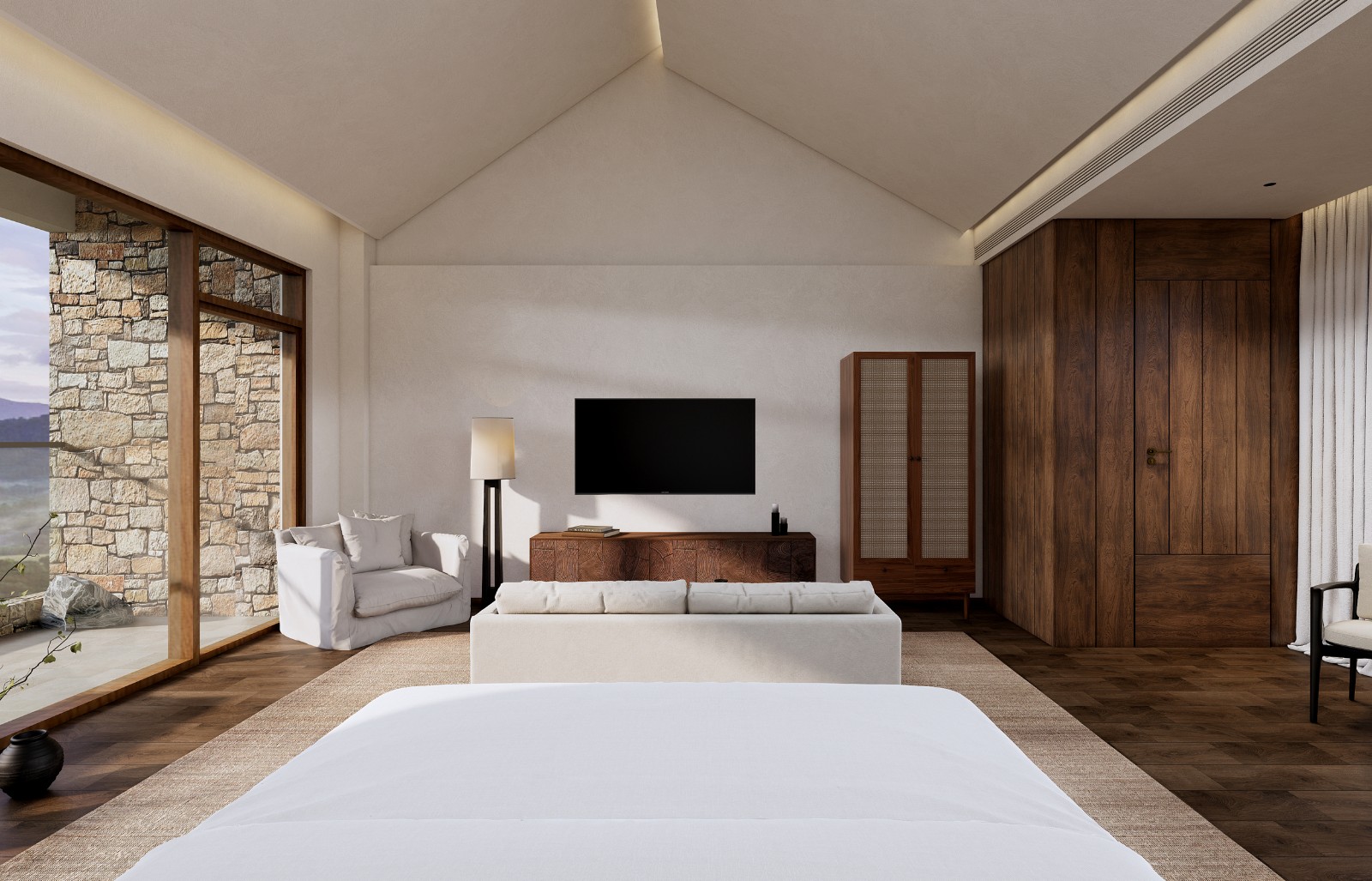 空间被拆解、重组。穹顶之下,睡眠区沉入半围合的“茧”中,粗麻帷幔垂落如息。榻上铺着未染色的苎麻床品,每一条褶皱都盛着阳光晒过的蓬松。浴区石块垒出天然泉池的模样,水流声成为唯一的白噪音。