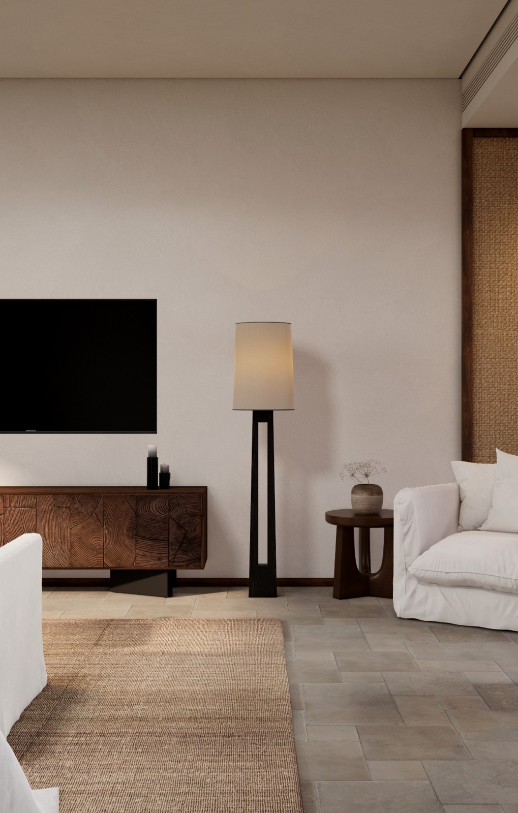 材质的呼吸感:微水泥、老榆木、亚麻、粗陶、素土
