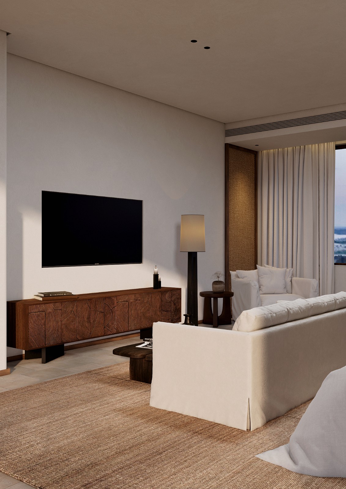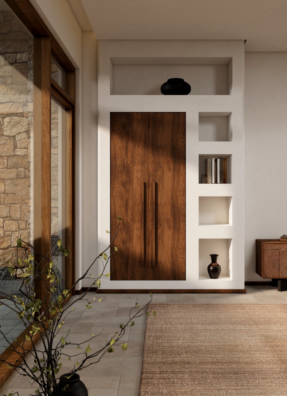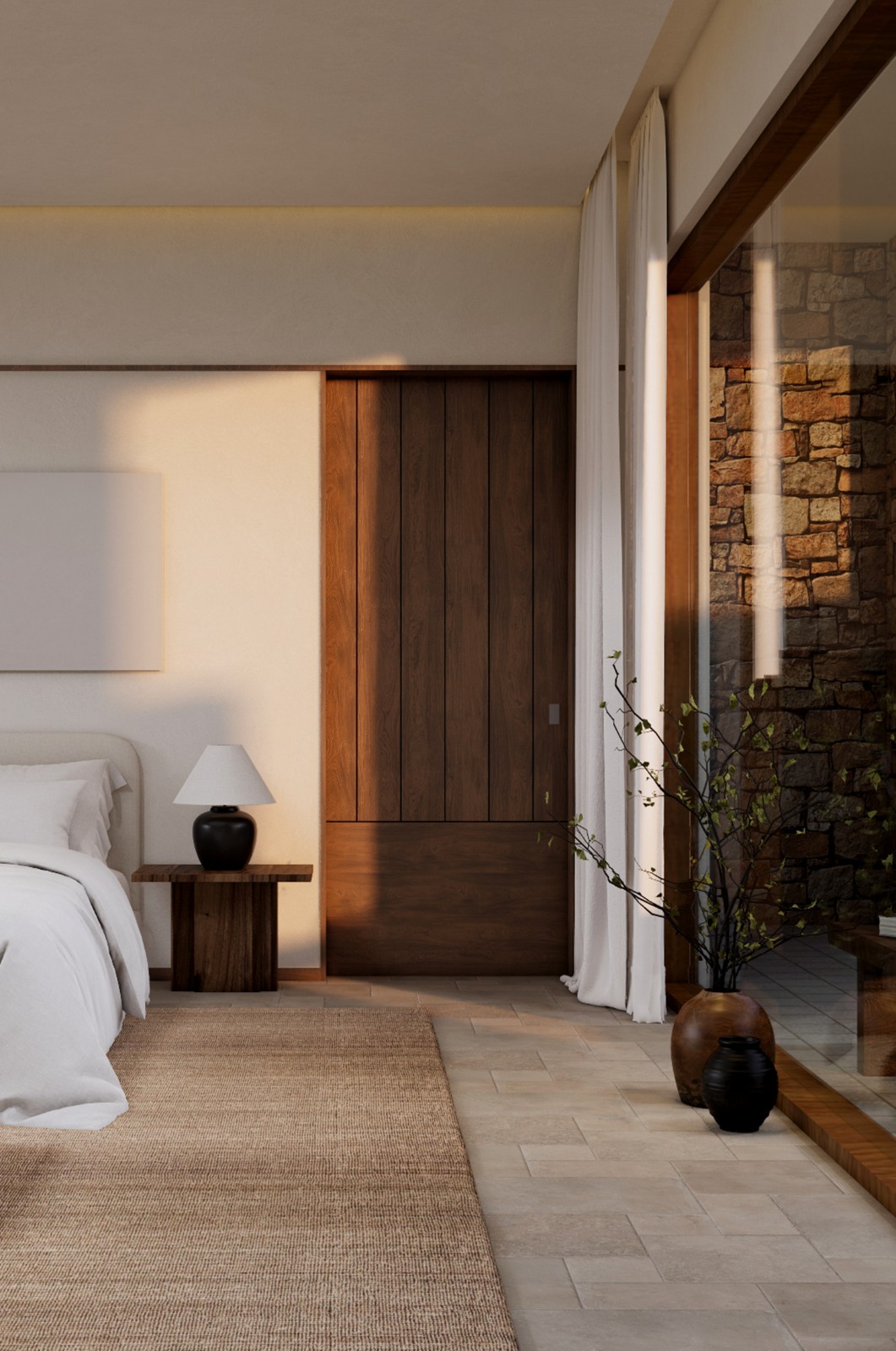 这不是一间房,而是一段被光阴抚摸过的留白。当城市在窗外加速,你在这里学会暂停。原生微水泥墙面保留了大地最初的呼吸,肌理如干涸河床,记录风的形状。老榆木梁悬垂而下,以弯曲的弧度拥抱空间——它曾是一棵树,如今成为时间的桥梁。
