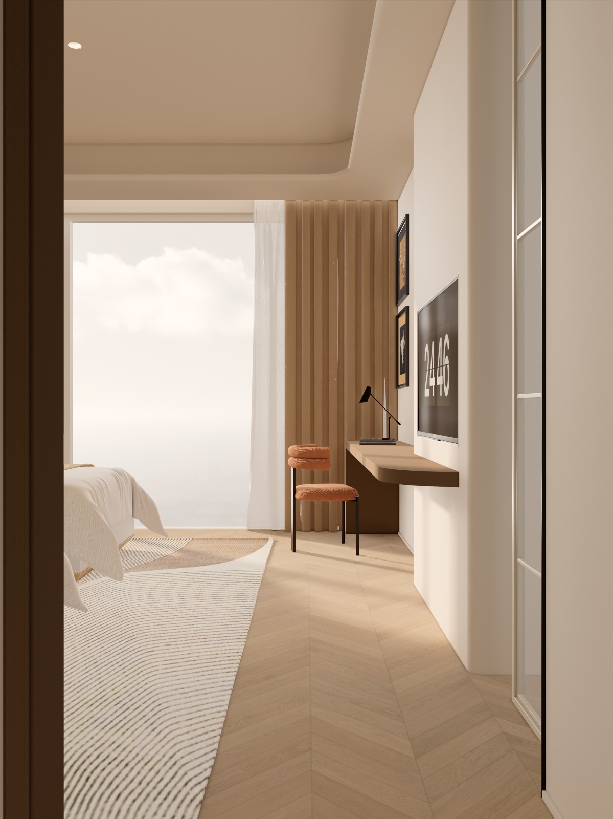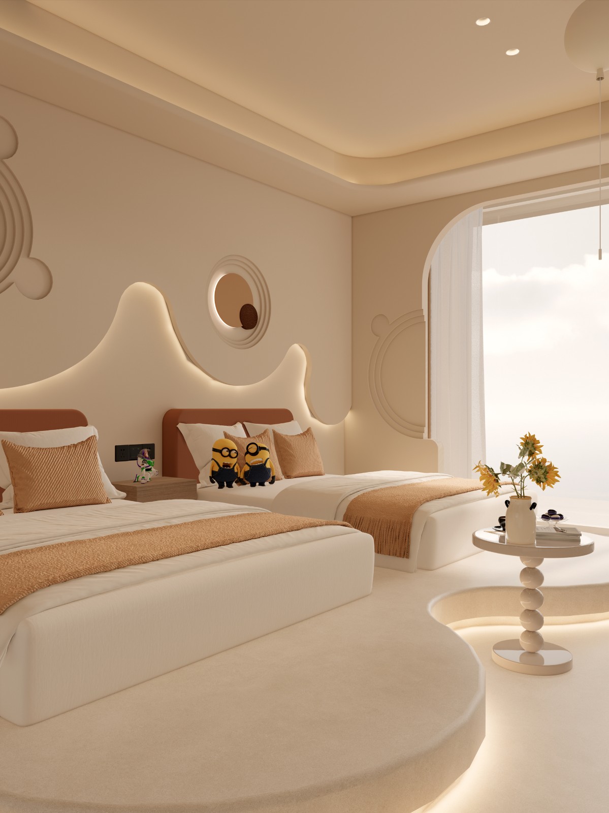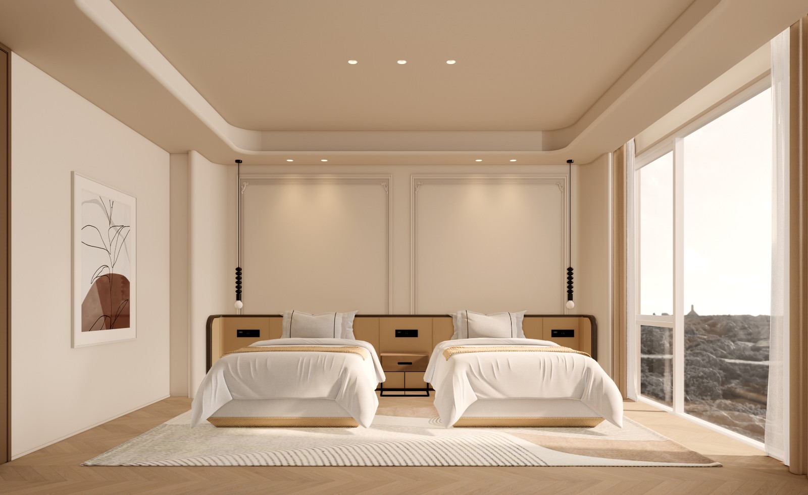 奶油风客房以 “温柔治愈” 为核心设计理念,摒弃尖锐线条与浓烈色彩,用柔润的色调、软糯的质感与通透的光影,构建一处既能卸下旅途疲惫,又能沉浸于慢时光的私属秘境。设计旨在平衡 “度假的松弛感” 与 “居家的归属感”,让每一位入住者都能在奶油色的包裹中,感受如同午后阳光般的温暖与惬意。