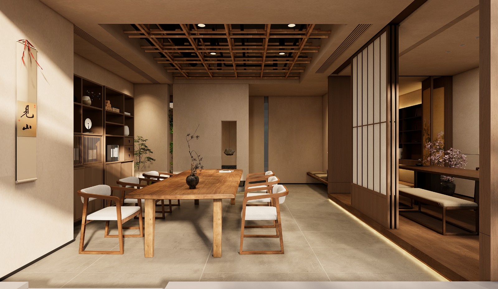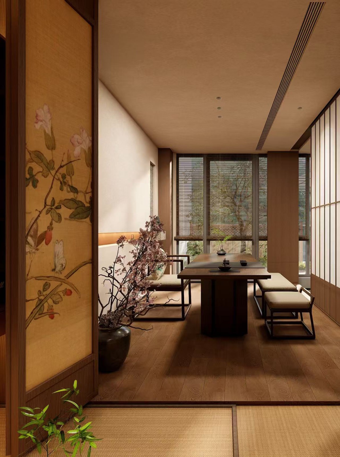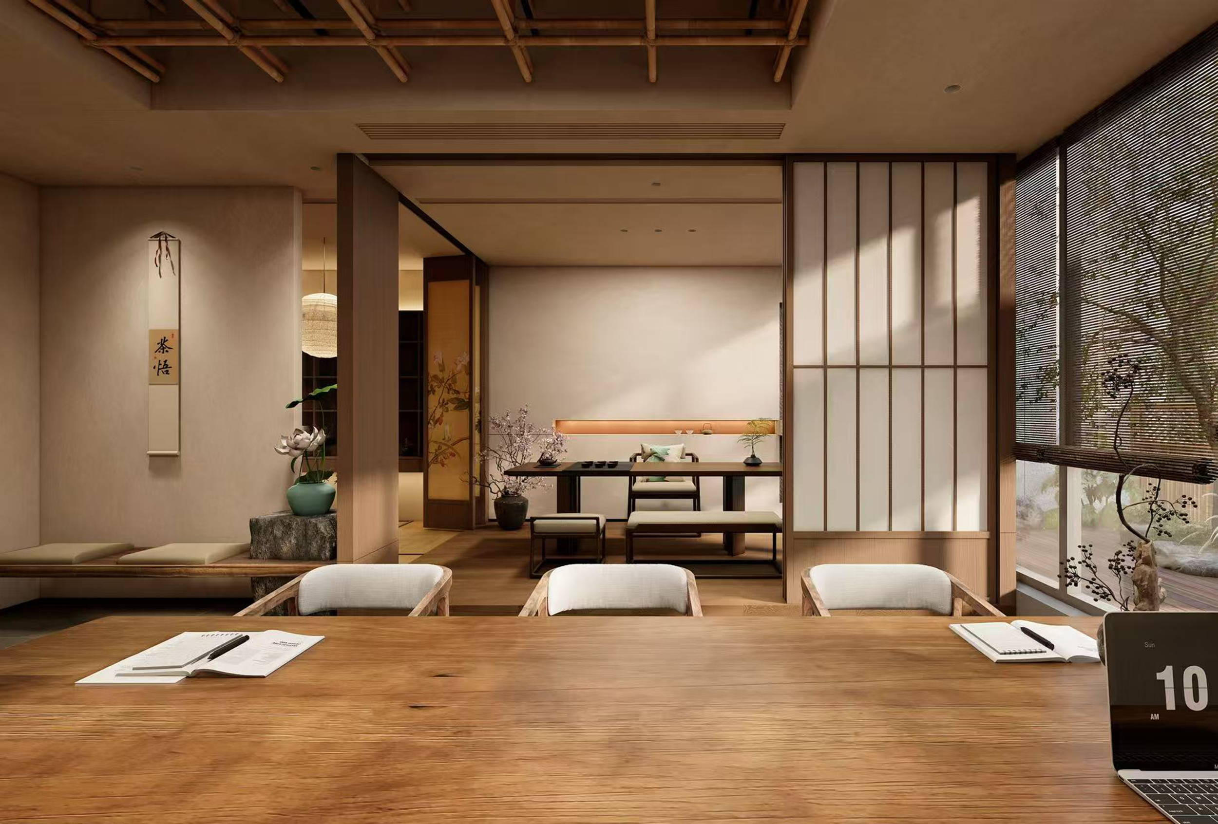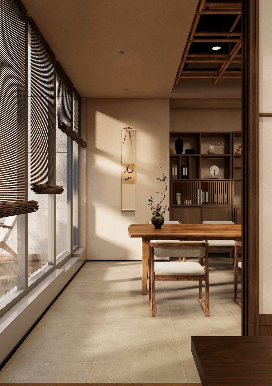 删繁就简,以原木与素墙为底,借一扇窗,将四时风景引入室内。光影透过木格栅,温柔地洒在茶席上,时间仿佛在此放慢了脚步。这里没有多余的装饰,只有足以容纳天地的空旷与宁静。