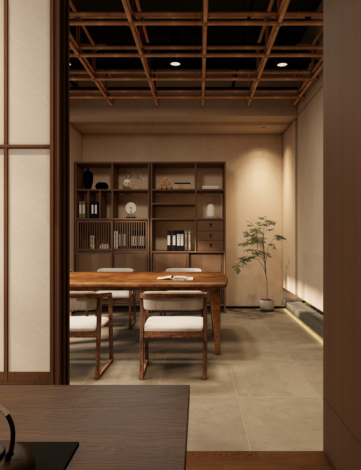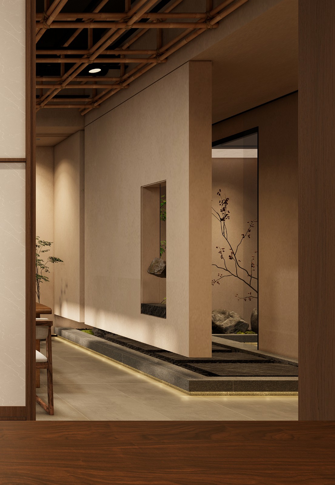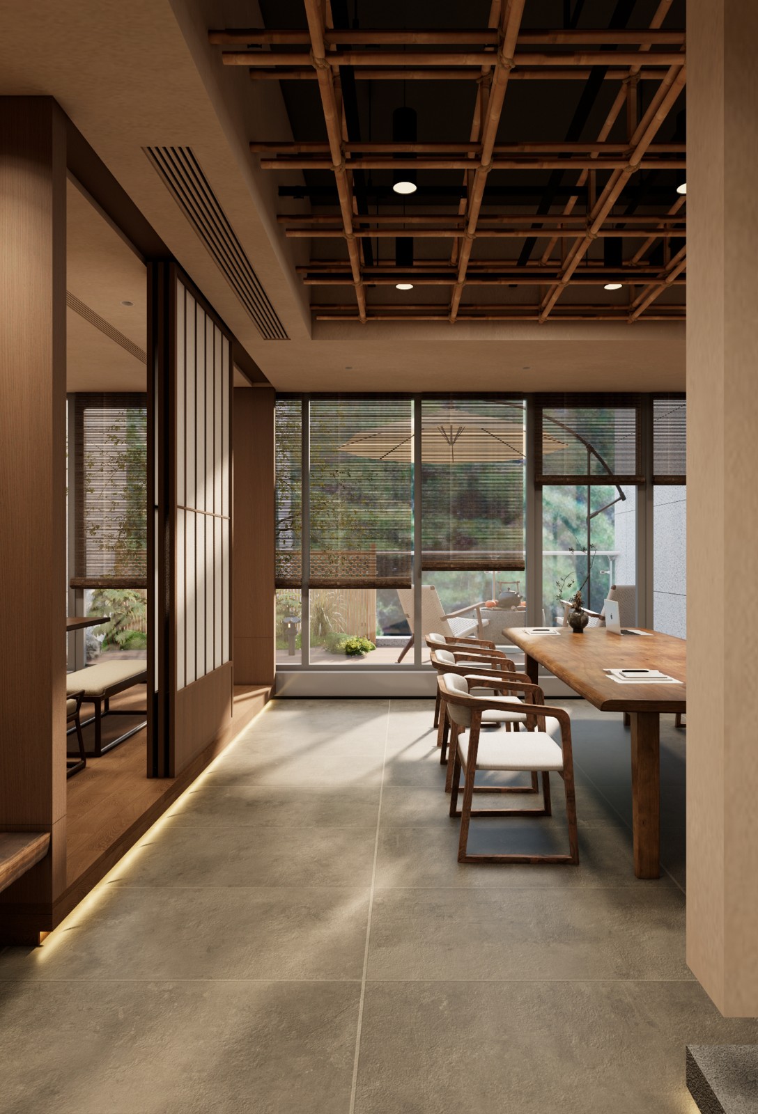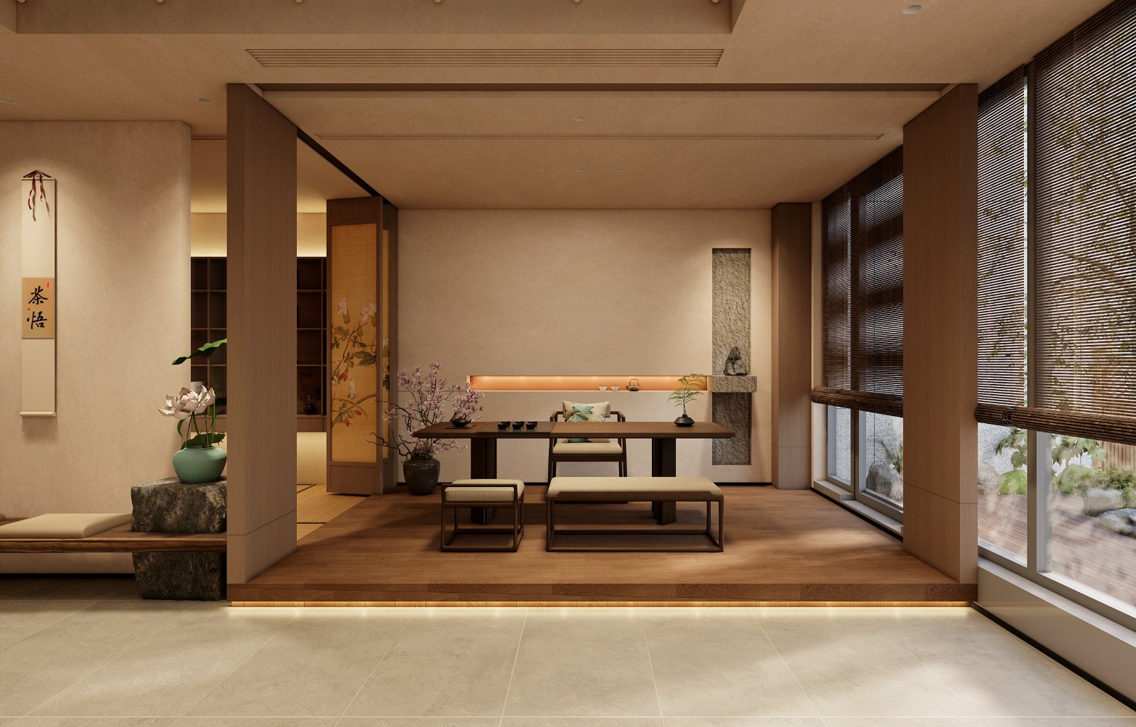 删繁就简,以原木与素墙为底,借一扇窗,将四时风景引入室内。光影透过木格栅,温柔地洒在茶席上,时间仿佛在此放慢了脚步。这里没有多余的装饰,只有足以容纳天地的空旷与宁静。
