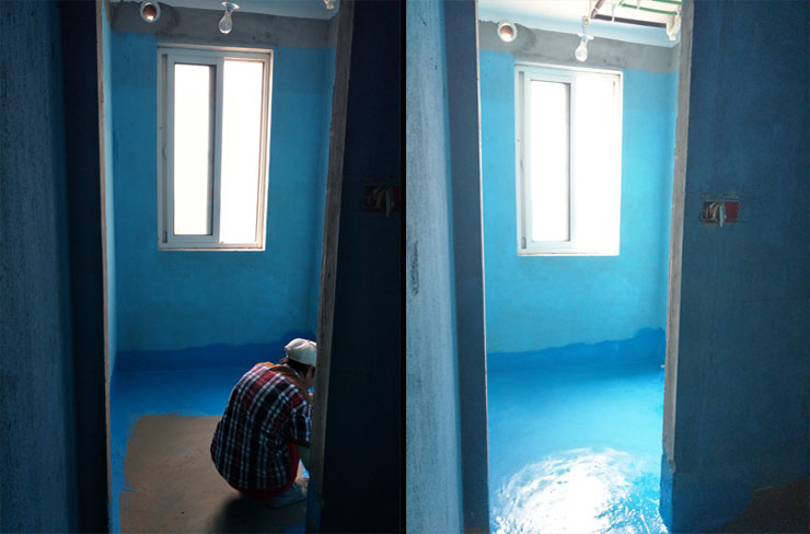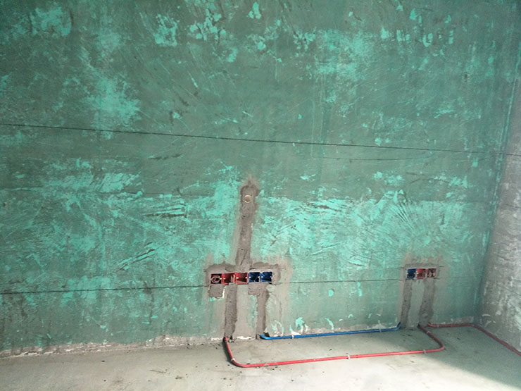 卫生间已经开始做防水啦,墙面防水刷两遍到顶。
