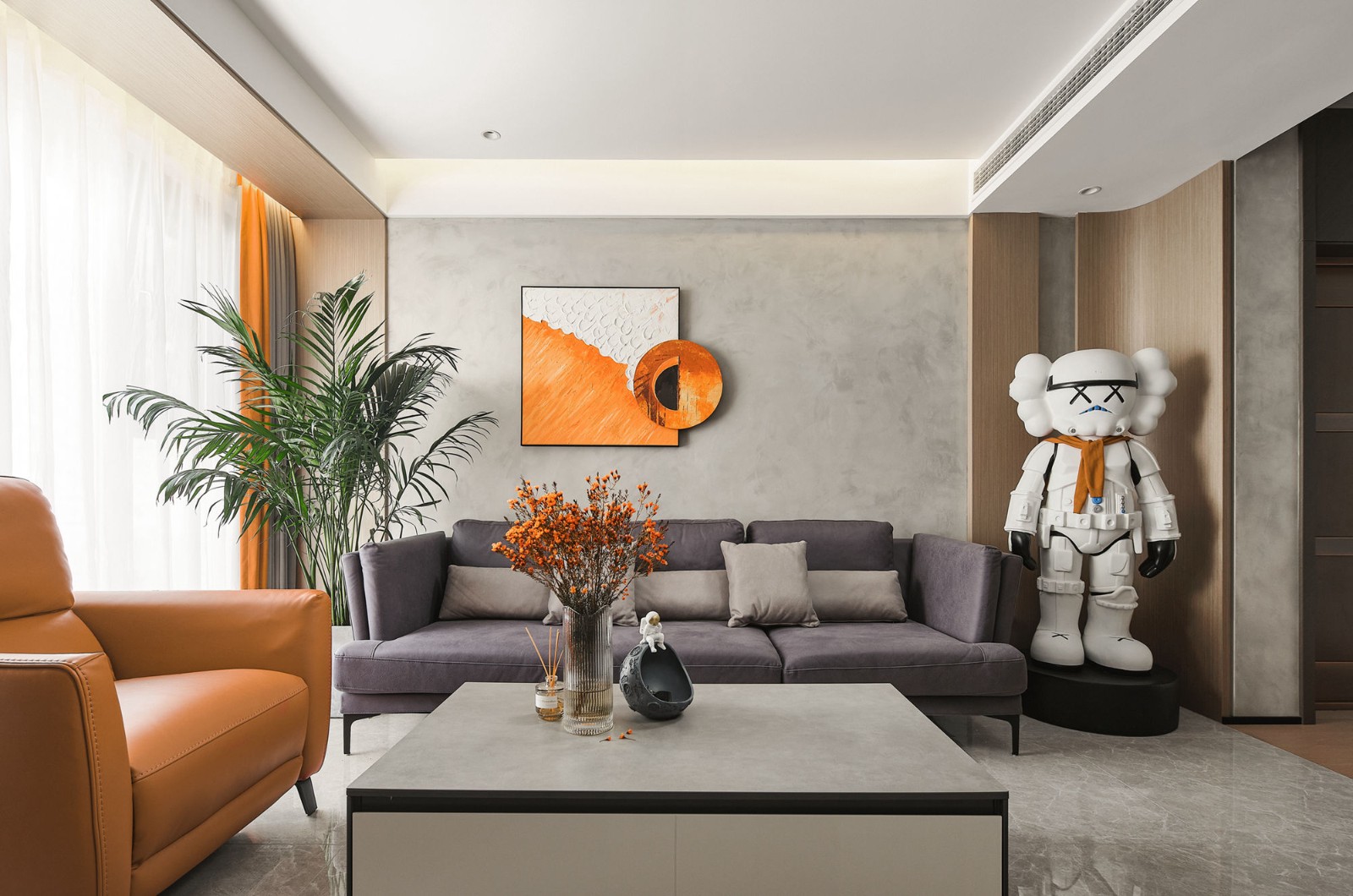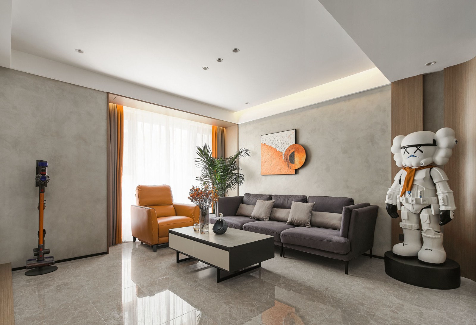 本案业主为一对年轻的新婚夫妇。为了满足基本的空间功能需求,在格局上没有做太大的改动,整体空间以灰白为主,同时增添了一些木色,软装上采用了爱马仕橙点亮了整个空间,纯净又不失温暖……