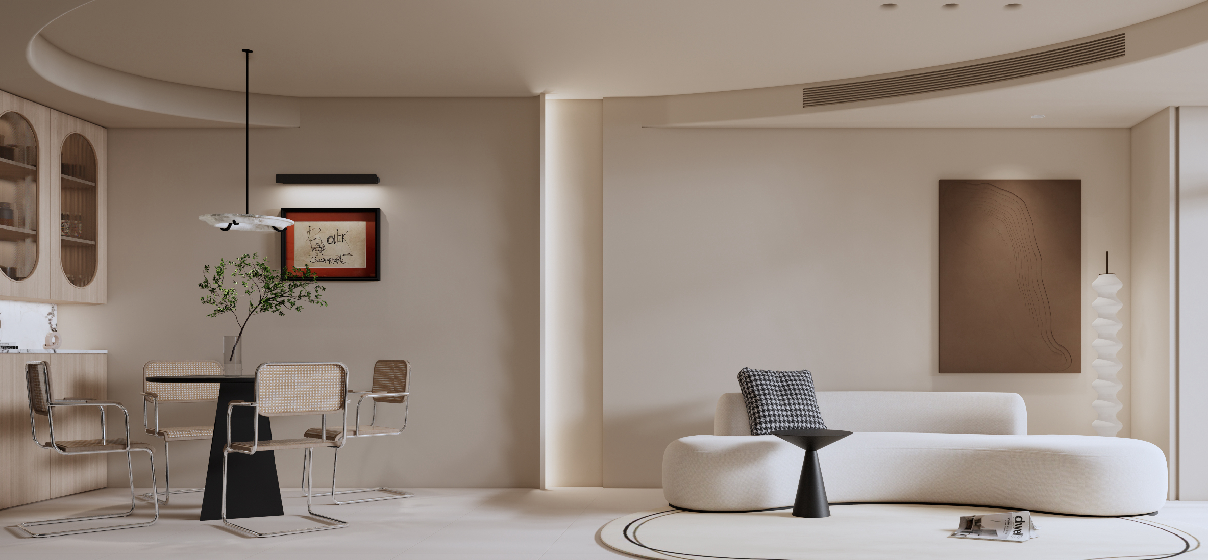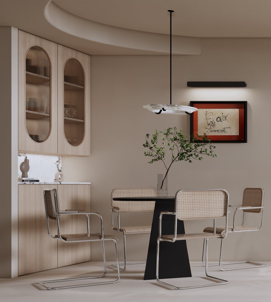 ▲圆弧的吊顶一样贯穿到餐厅,木色柜体使得空间更加的宁静。