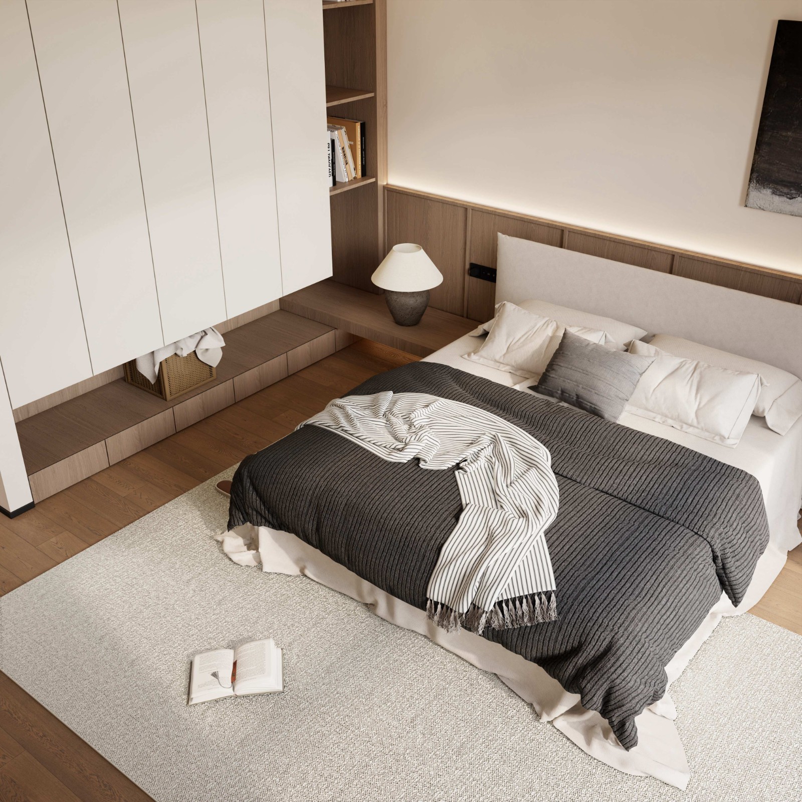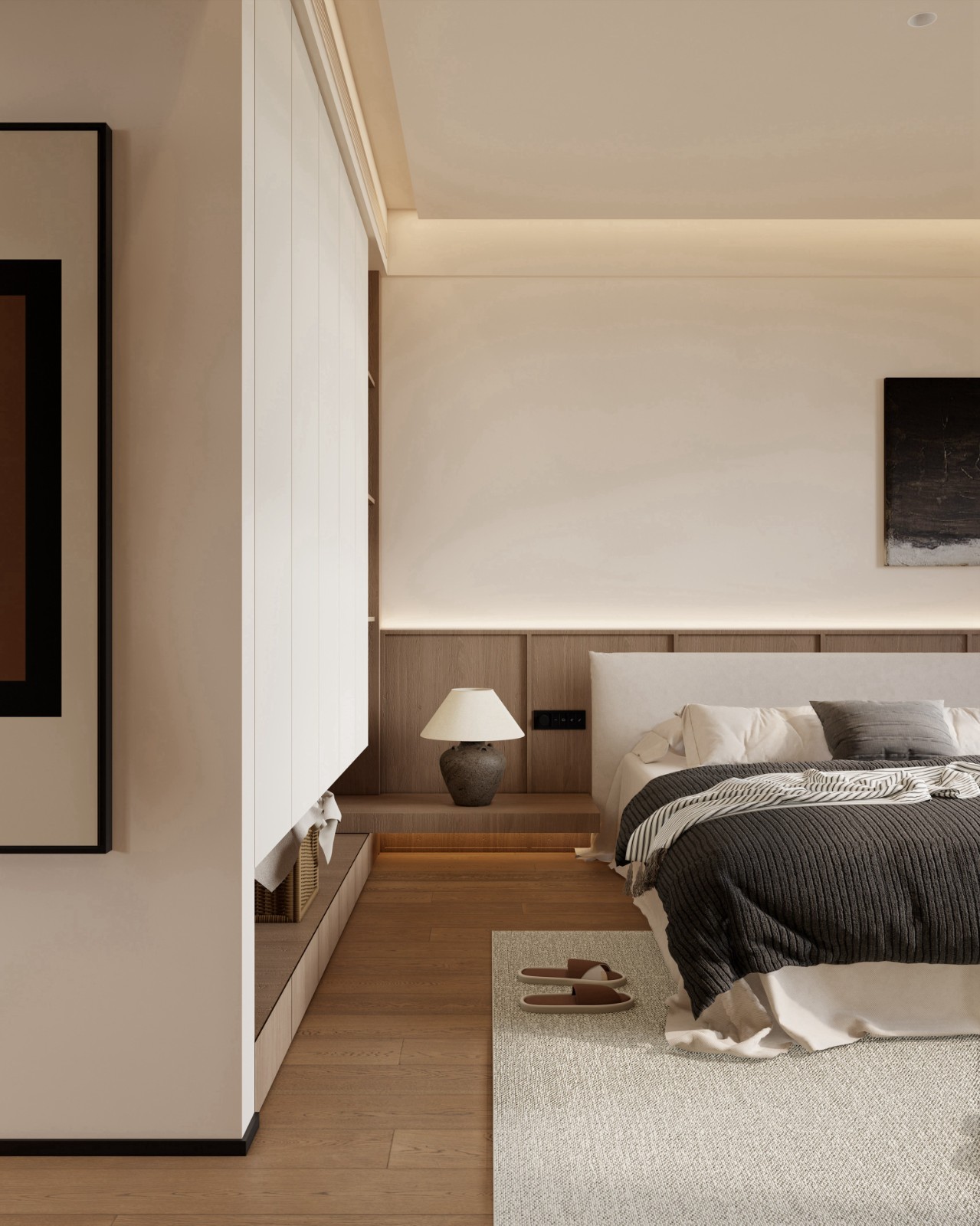 这是品茶区,业主平时有品茶的习惯,茶桌背后做了些格子,用来放一些茶具和书。