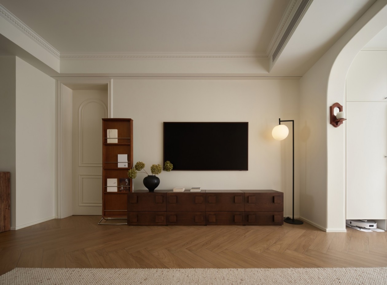 ▲电视旁的移动柜子,让空间更一层次感,同时也方便移动。