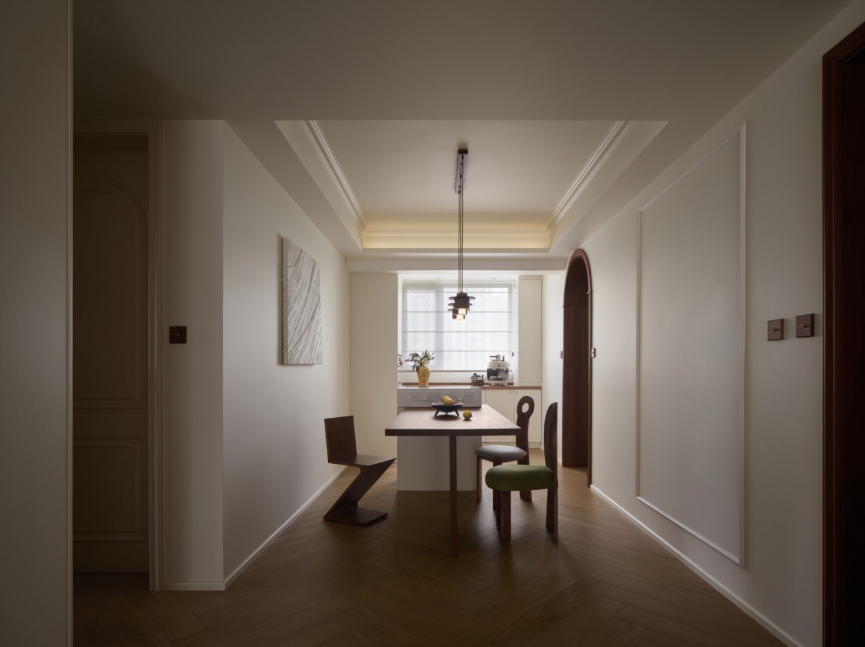 ▲有规律的弧形与直线的交织,全屋以木百叶搭配亚麻纱帘过滤偶尔强烈的光线,光影的氛围映在木与石的纹理之上,质感与光影结合。