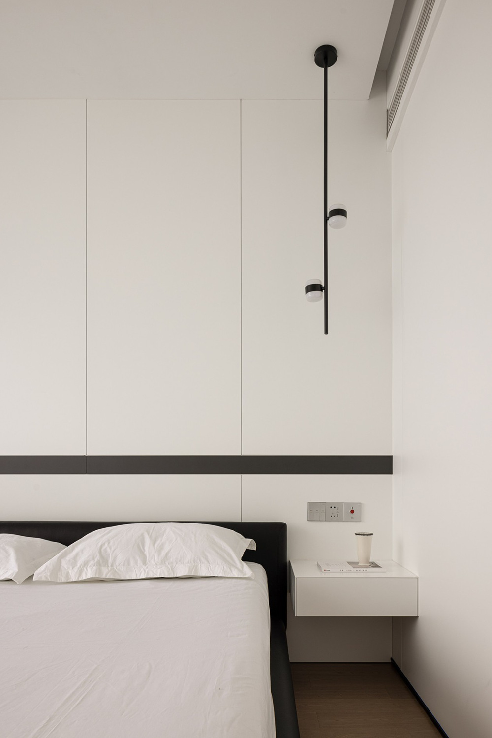 ▼主卧贯彻当代语态,以流畅的黑白线条修饰极简框架,剔除繁杂思绪,入室皆安。