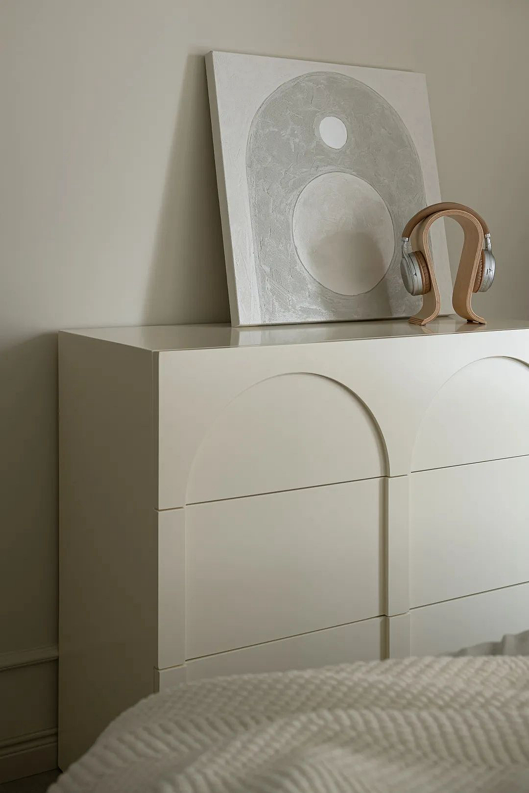 墙面采用简单利落的法式线条饰面,简约的线条增加了卧室的仪式感,床尾选择与空间色调统一的奶油色系成品斗柜,斗柜不同的材质为空间带来别样的质感。
