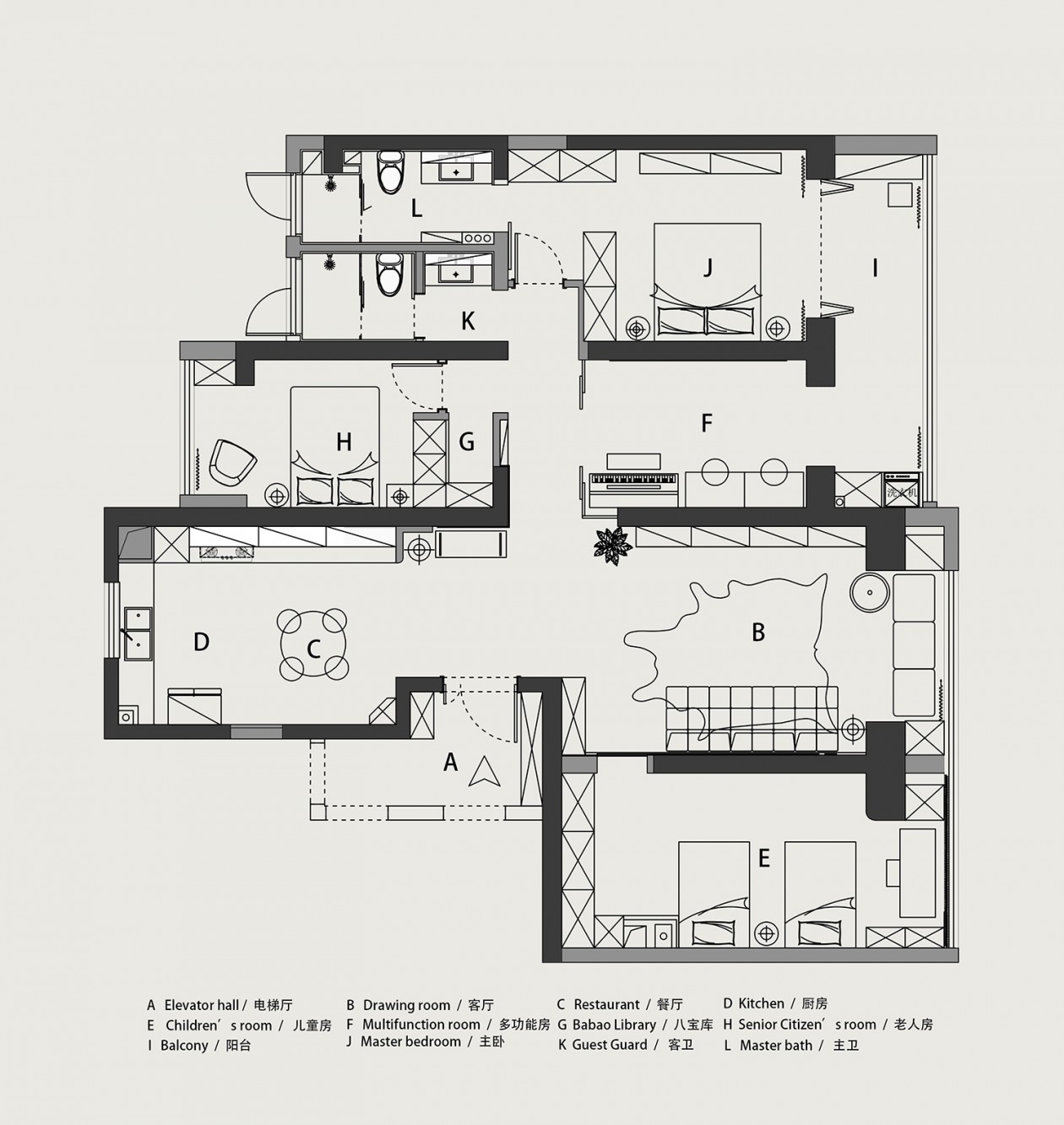 主卧敞开的通道,会转折连接起隔壁的琴房,玻璃折叠门以纤细的姿态攀绕在空间中,给一览无余的空间增加了如梦似幻的阻断,储物隐于墙面基色,更加突出休息区域的慵懒松弛。