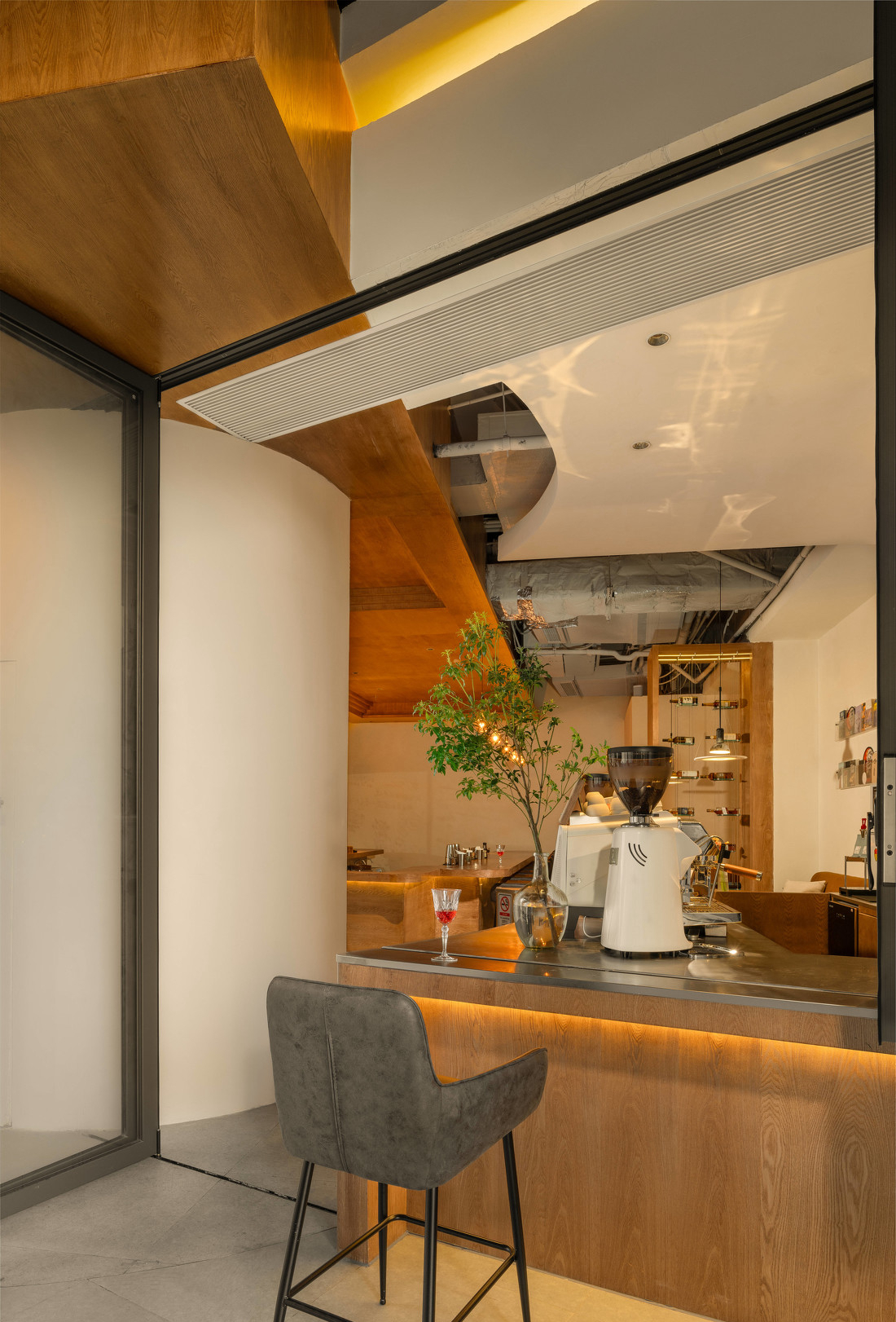 🔳围绕着圆柱分别设置两个大区域吧台,靠街边的一侧是日咖吧台,方便赶时间的客人和外卖小哥就近点餐和取餐,晚上切换为夜酒的时候也能提供给爱抽烟和安静的客户使用。店中间的吧台是夜酒C字型大吧台区,一左一右组合成两个不同调酒风格的调酒区和客座区。