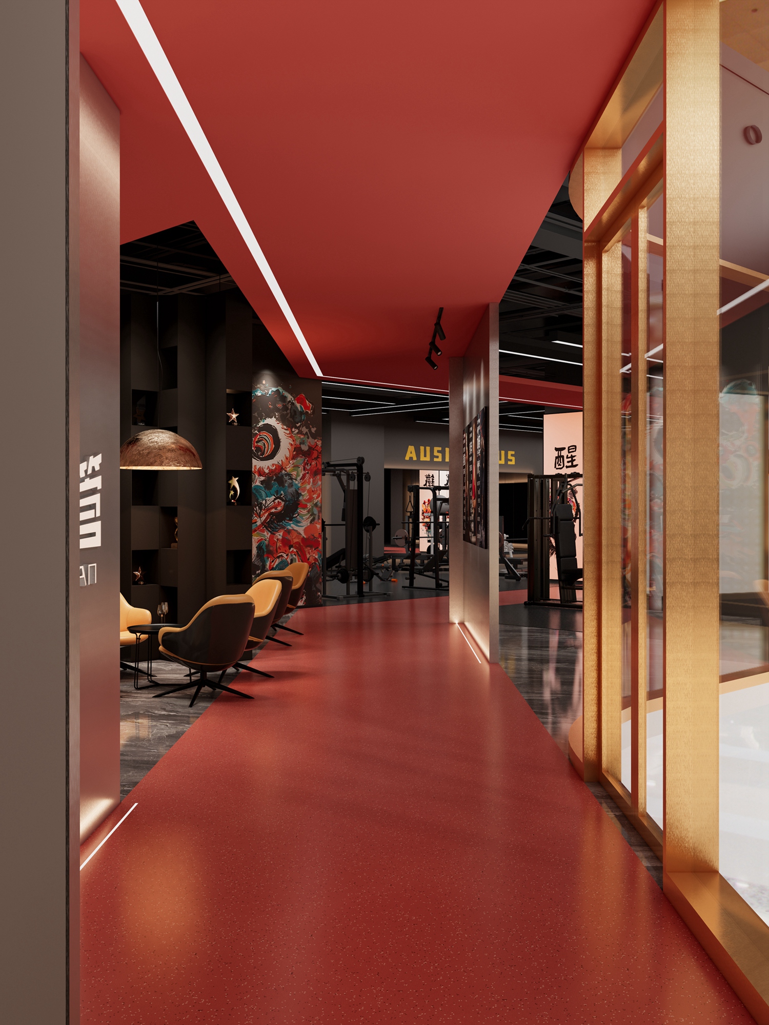 本案为健身房改造项目,以"狮王争霸"为主题,打造极具视觉冲击力的国潮风健身空间。设计团队突破传统,大胆采用"天地同辉"的创意手法——顶部悬浮式红色吊顶与地面定制红色地胶形成上下呼应,犹如雄狮腾跃的轨迹贯穿全场。墙面运用3D立体彩绘工艺,将醒狮图腾与现代健身场景完美融合,配以动态光影效果的LED灯箱,生动再现狮王争霸的震撼场面。整体空间通过解构传统醒狮元素,结合工业风材质与赛博朋克灯光技术,创造出既传承岭南文化精髓,又充满未来科技感的硬派健身空间,重新定义国潮运动美学。
