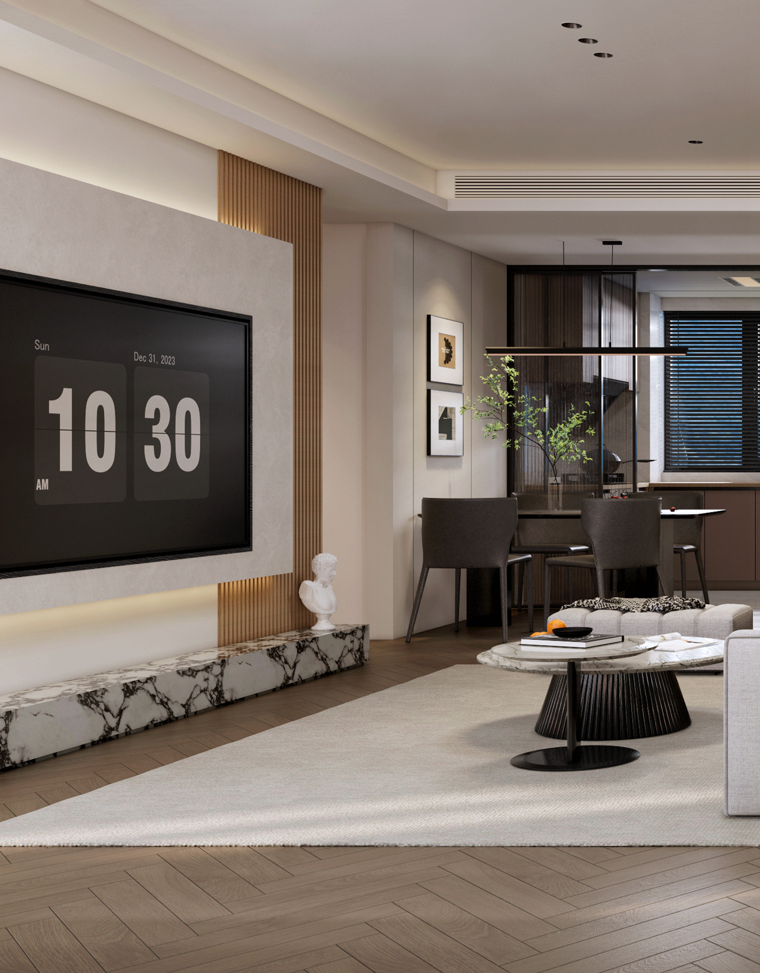 ▲电视背景墙采用了石膏板与原木格栅的组合,显得更有设计感。