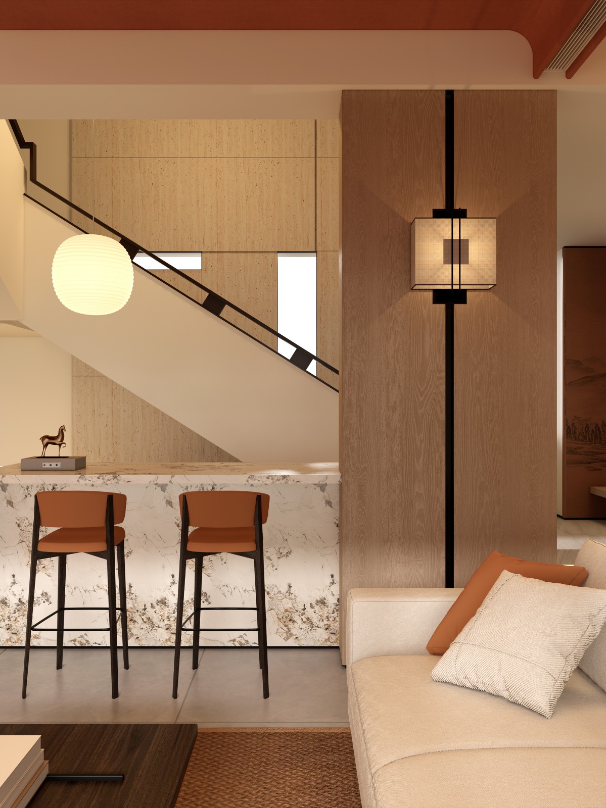 光影序列:全线采用2700K低色温照明,重点区域以磁吸轨道射灯营造山水画“留白”意境。