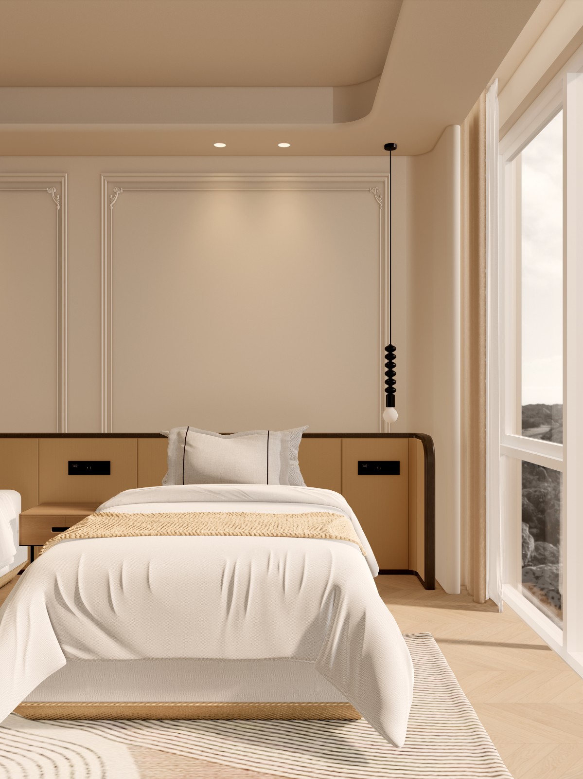 奶油风客房以 “温柔治愈” 为核心设计理念,摒弃尖锐线条与浓烈色彩,用柔润的色调、软糯的质感与通透的光影,构建一处既能卸下旅途疲惫,又能沉浸于慢时光的私属秘境。设计旨在平衡 “度假的松弛感” 与 “居家的归属感”,让每一位入住者都能在奶油色的包裹中,感受如同午后阳光般的温暖与惬意。