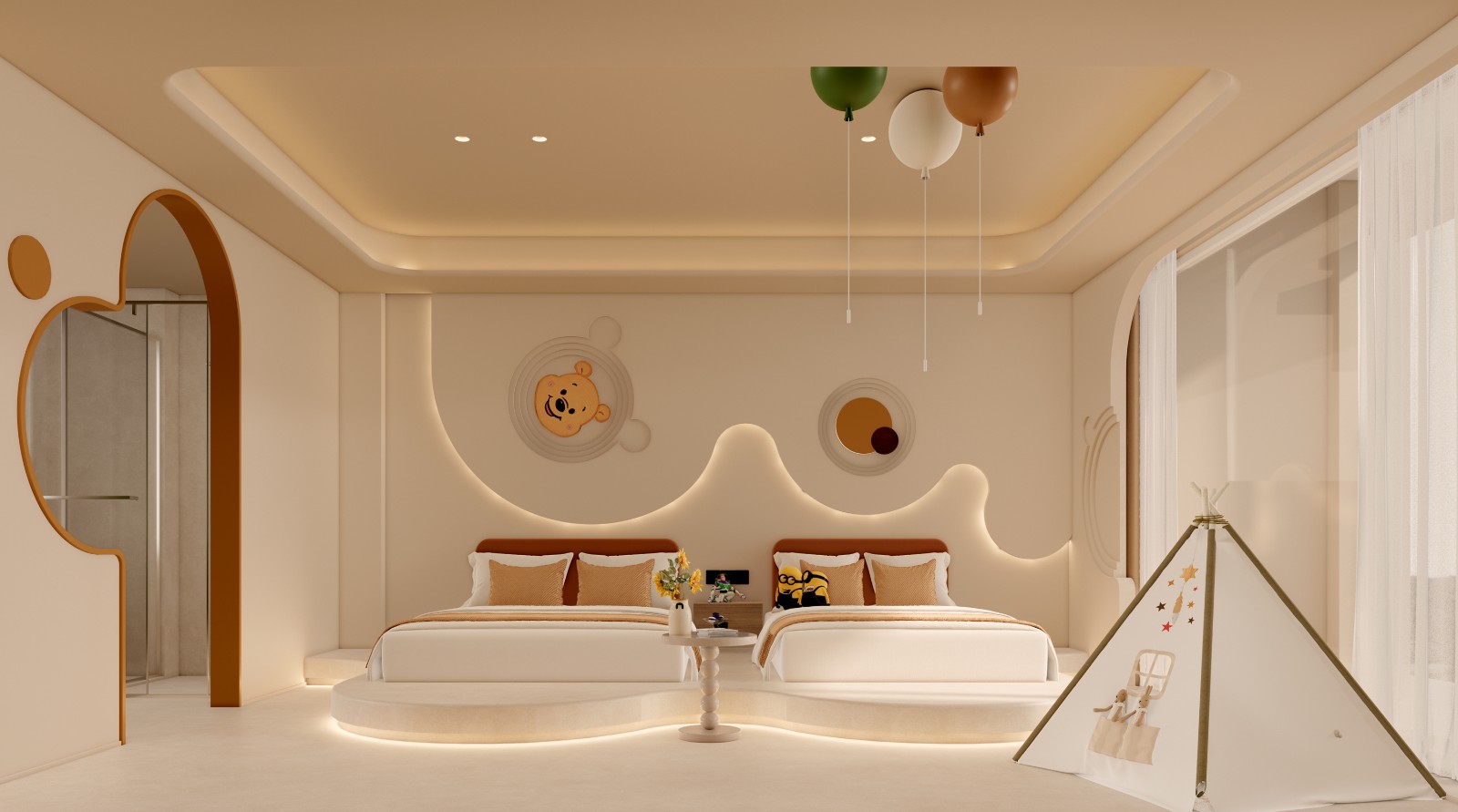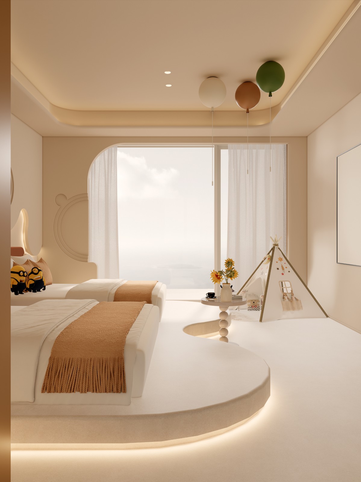 当奶油色从墙壁流淌到地毯,整个房间便成了一个巨大的温柔拥抱。阳光透过亚麻窗帘,把空气晒成暖融融的甜——这里没有棱角分明的世界,只有圆润的弧线、可爱的气球灯,和等着被发现的童话秘密。