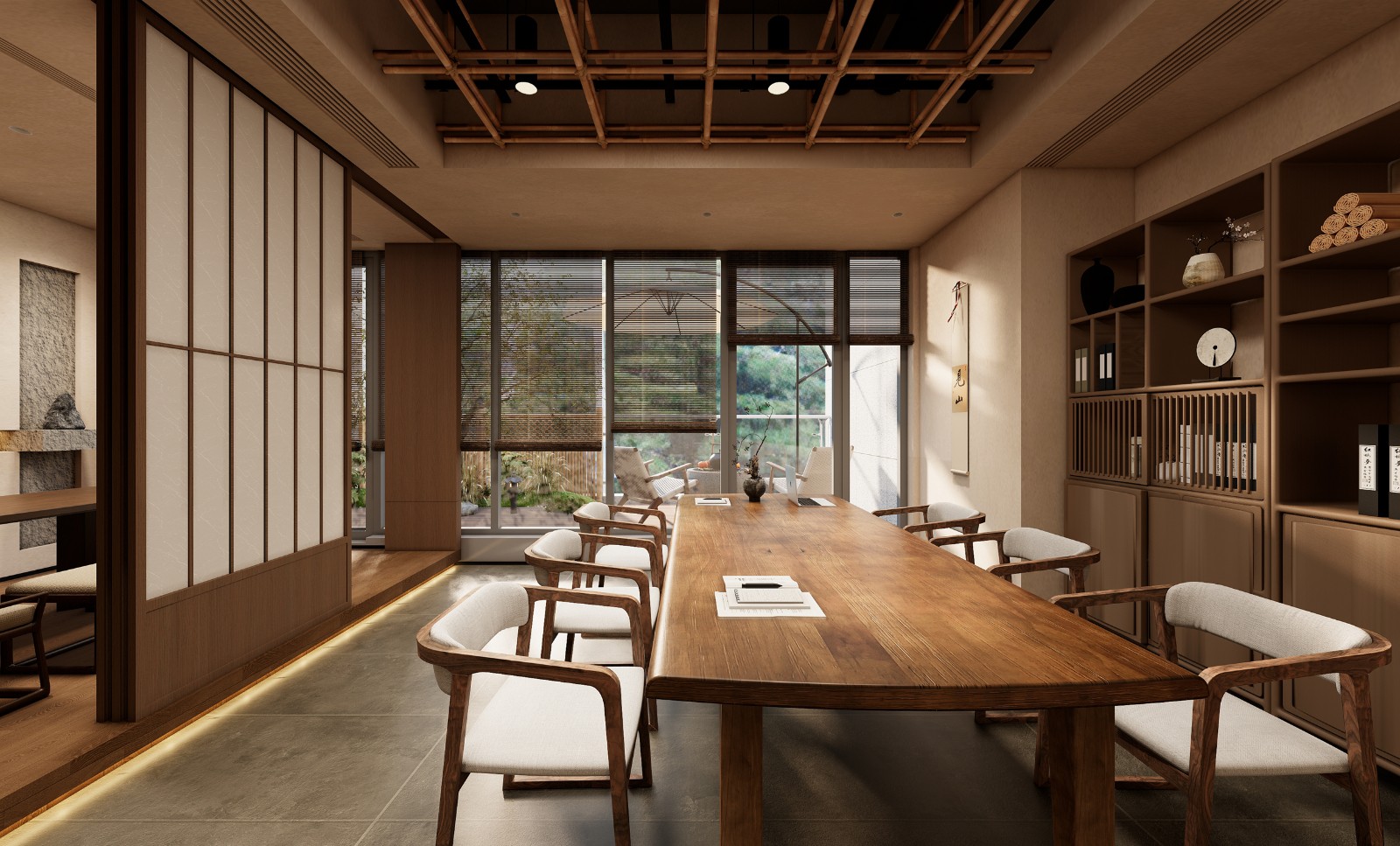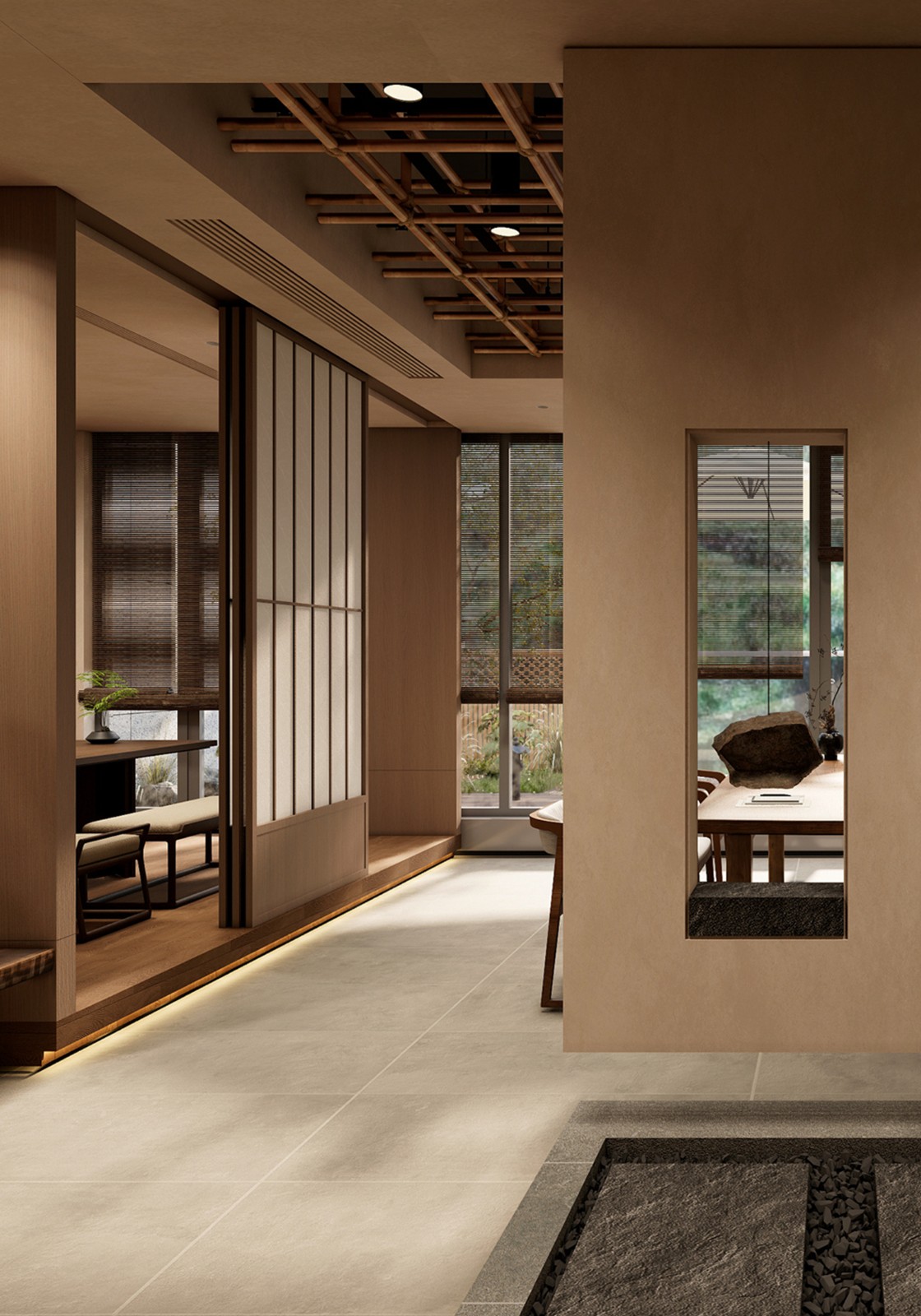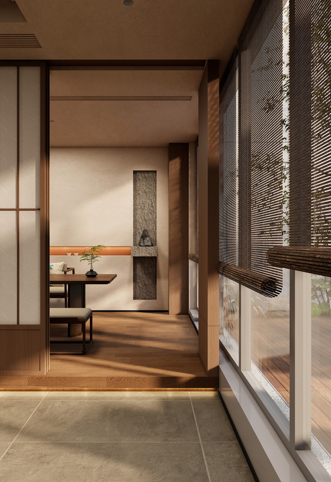 删繁就简,以原木与素墙为底,借一扇窗,将四时风景引入室内。光影透过木格栅,温柔地洒在茶席上,时间仿佛在此放慢了脚步。这里没有多余的装饰,只有足以容纳天地的空旷与宁静。