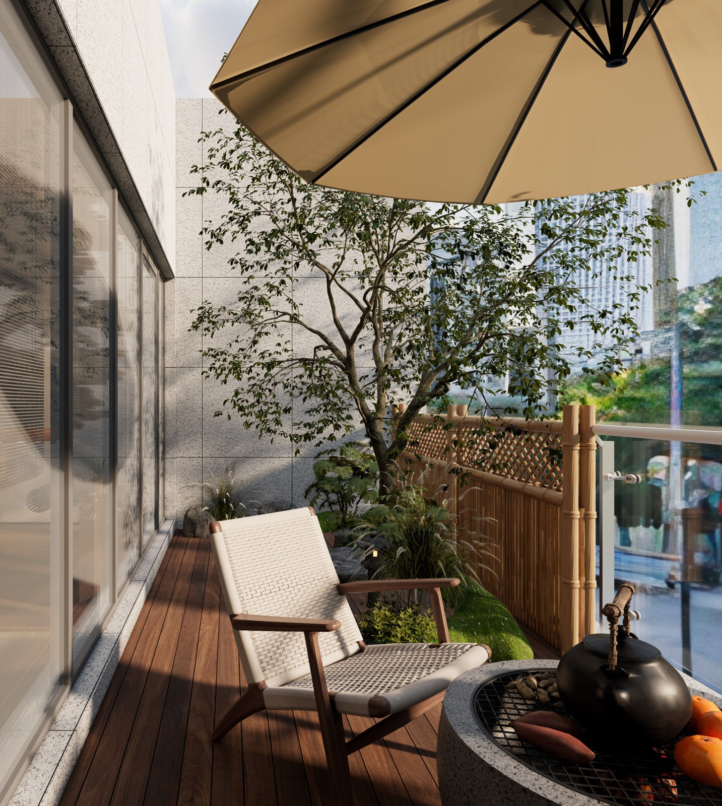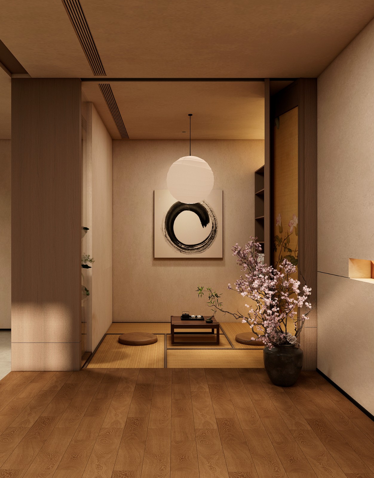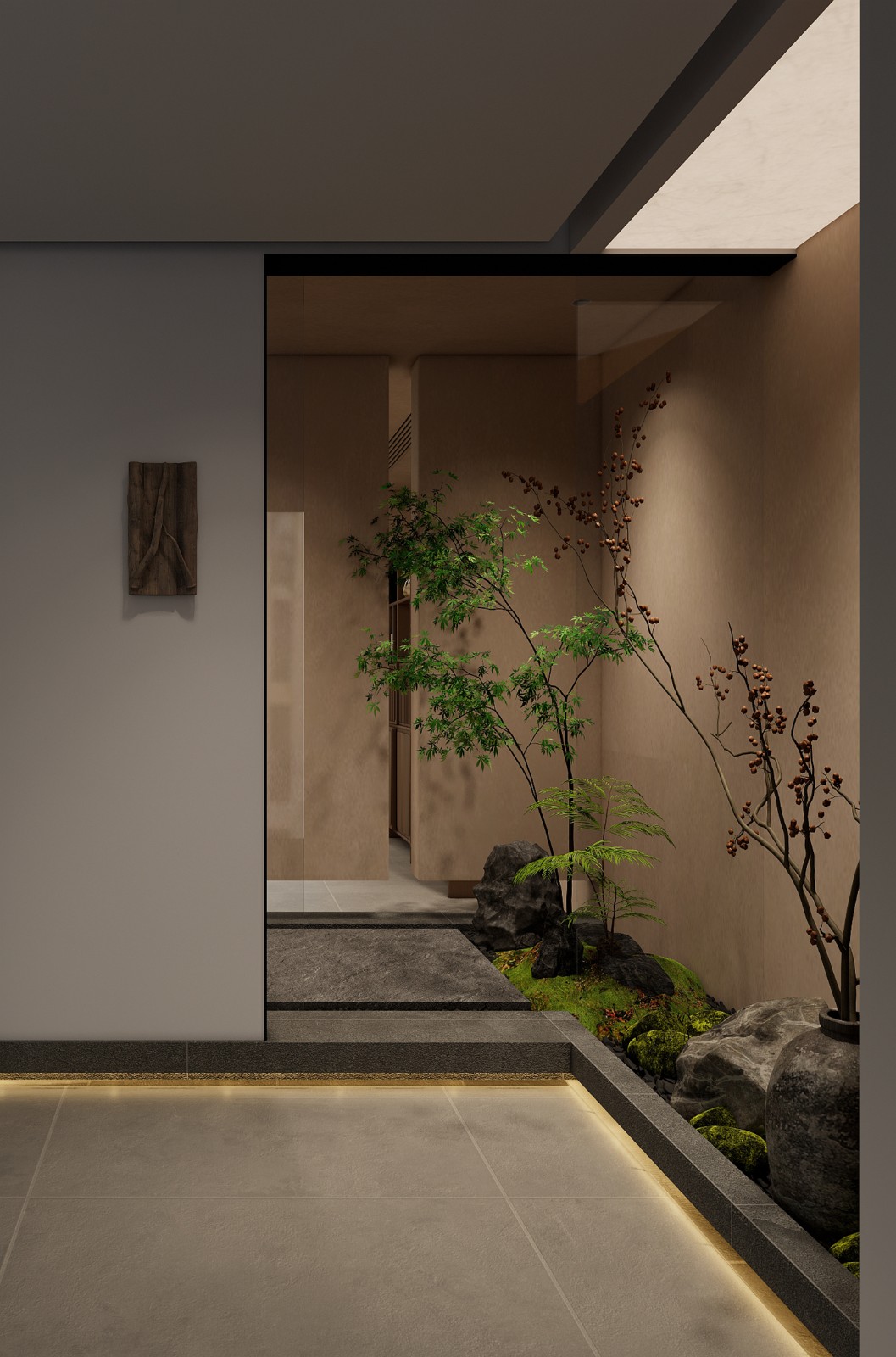 删繁就简,以原木与素墙为底,借一扇窗,将四时风景引入室内。光影透过木格栅,温柔地洒在茶席上,时间仿佛在此放慢了脚步。这里没有多余的装饰,只有足以容纳天地的空旷与宁静。